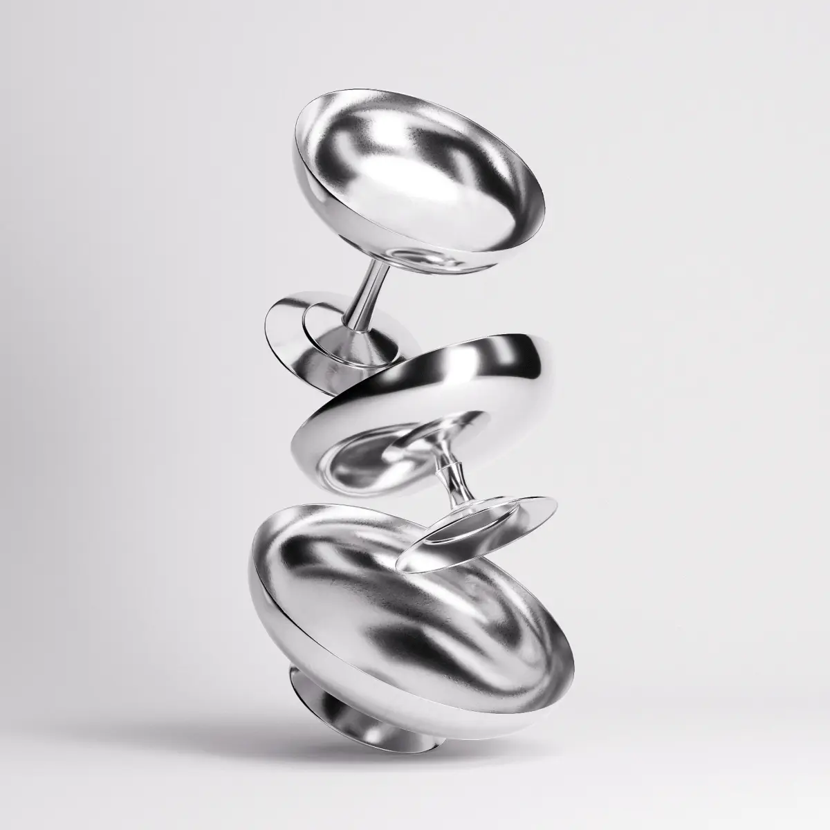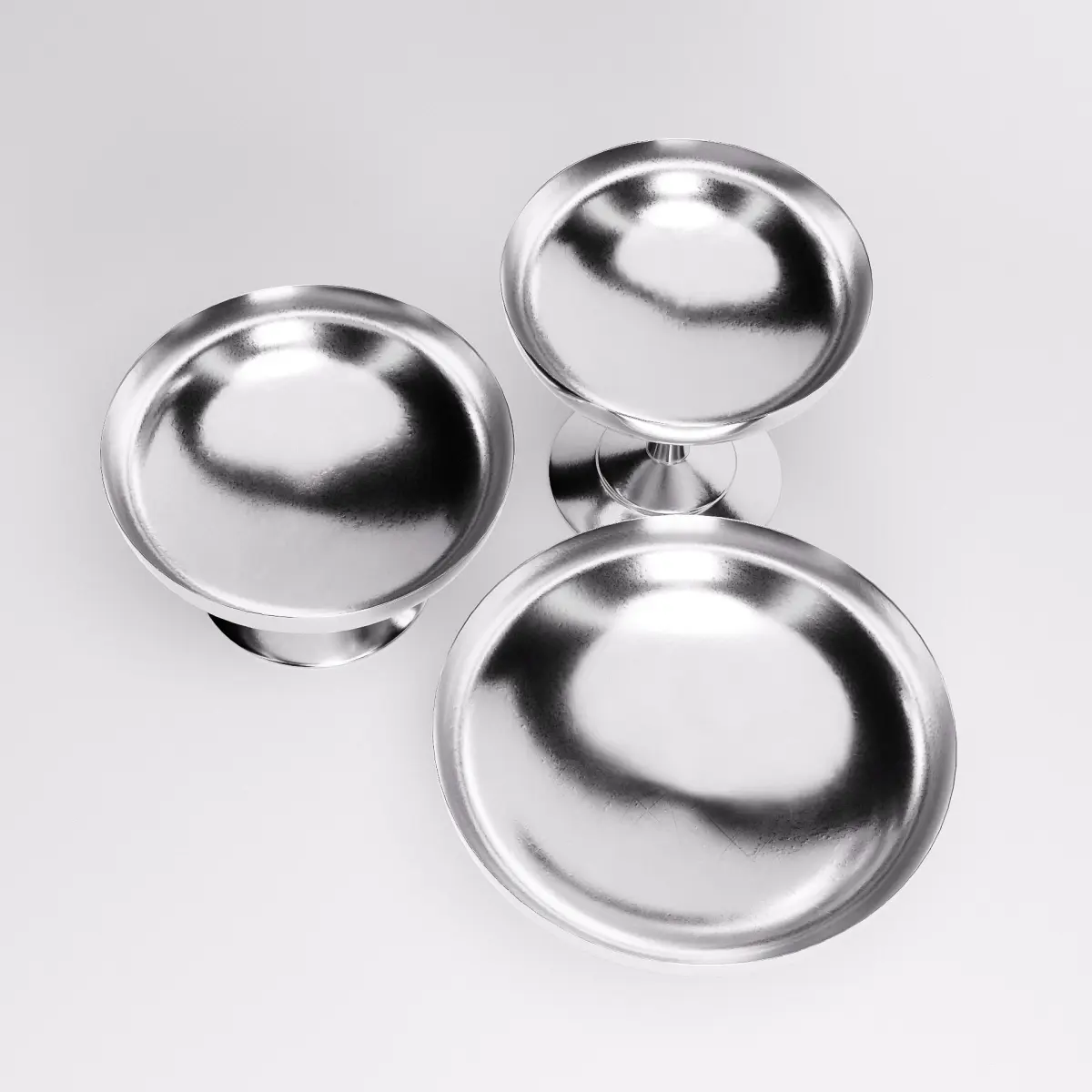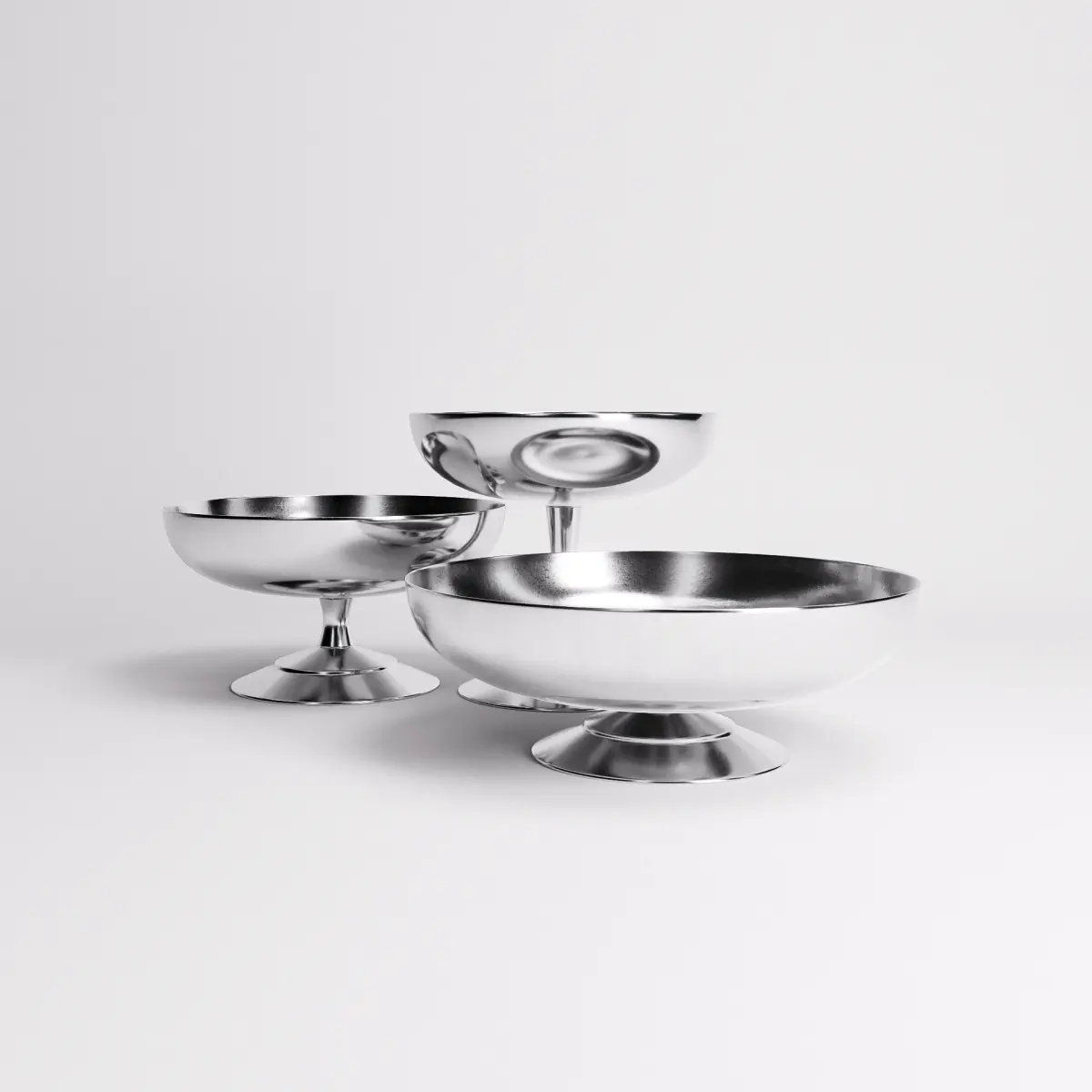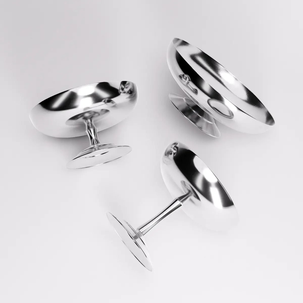 Echoing the elegance of mid-century dessertware, this set of stainless steel ice cups features soft curves, flared stems, and a polished mirrored finish. Each piece reflects light with subtle distortion, emphasizing their smooth contours and sculptural simplicity. Ideal for retro-inspired scenes, dining compositions, or product visuals, the set brings a cool, understated glamour to tabletop storytelling.