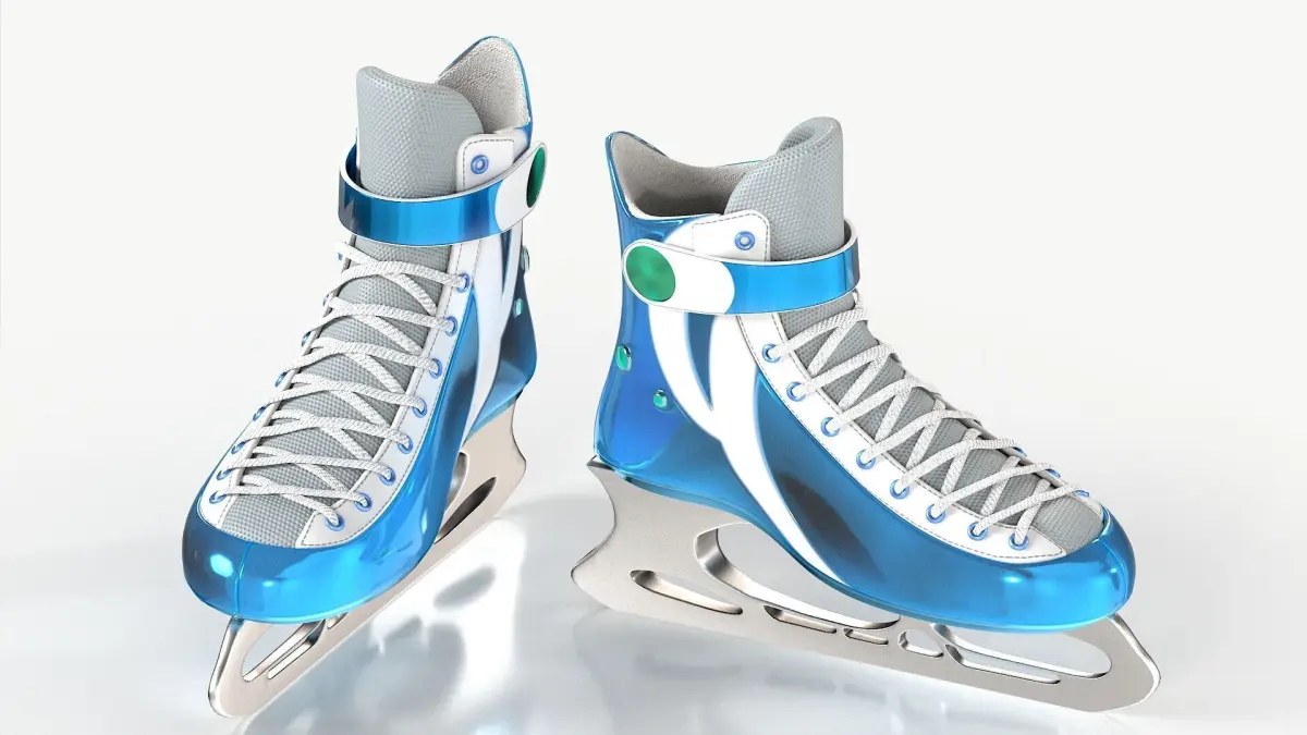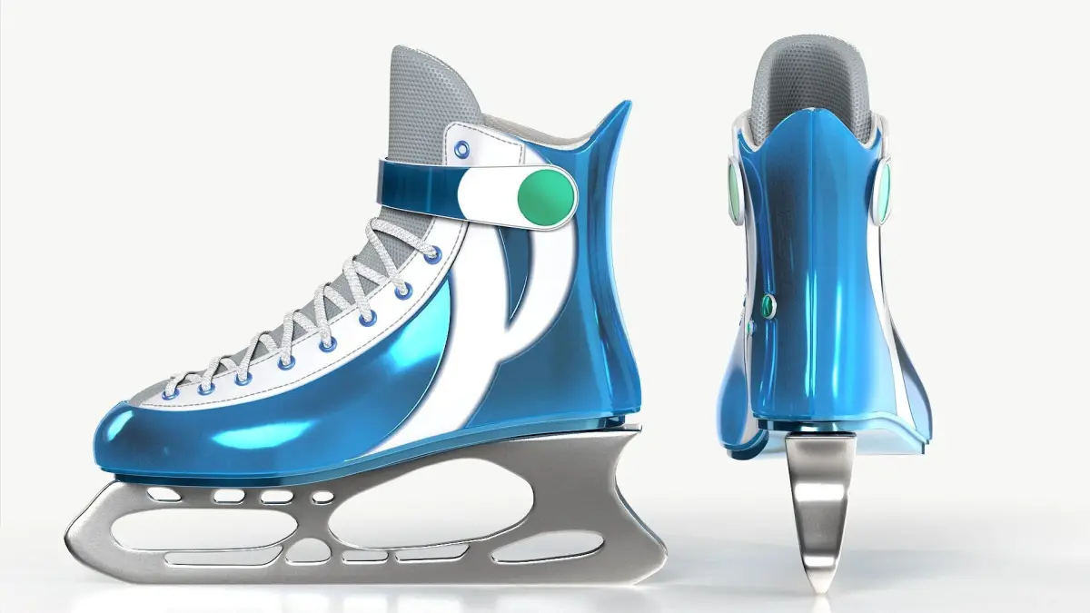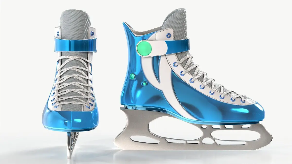 Futuristic ice skates with a translucent blue hue and neon accents, featuring advanced technology for enhanced speed and agility on the ice. The cutting-edge design offers a glimpse into the potential of ice skating in the current timeline.