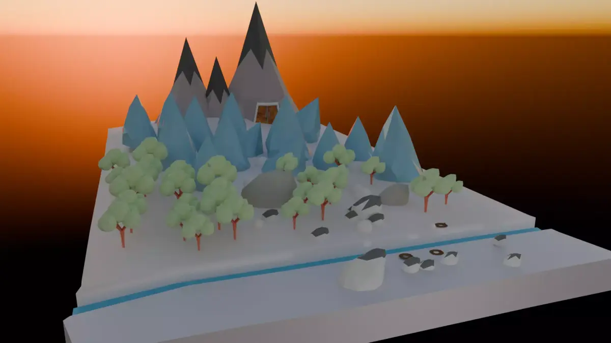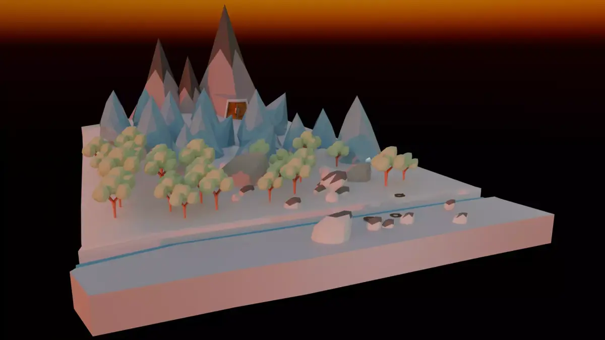 The lighting (as seen in the renders) transitions from a warm, atmospheric orange sunset glow in the background to a cool, neutral tone in the foreground. This highlights the faceted geometry, creating sharp shadows and clear silhouettes that define the low-poly style.