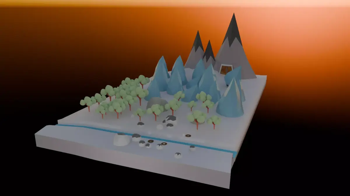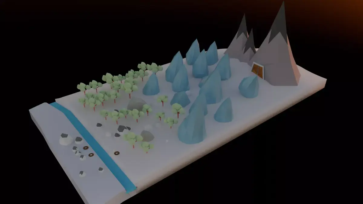 This low-poly ice world environment is a stylistically cohesive 3D diorama designed for games, VR experiences, or lightweight animations. It features a charming winter wonderland aesthetic with a balanced distribution of environmental assets and a clean, faceted look.