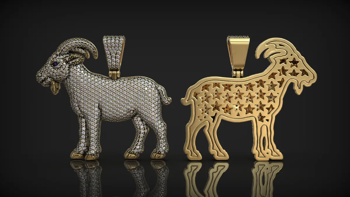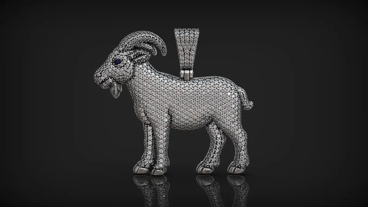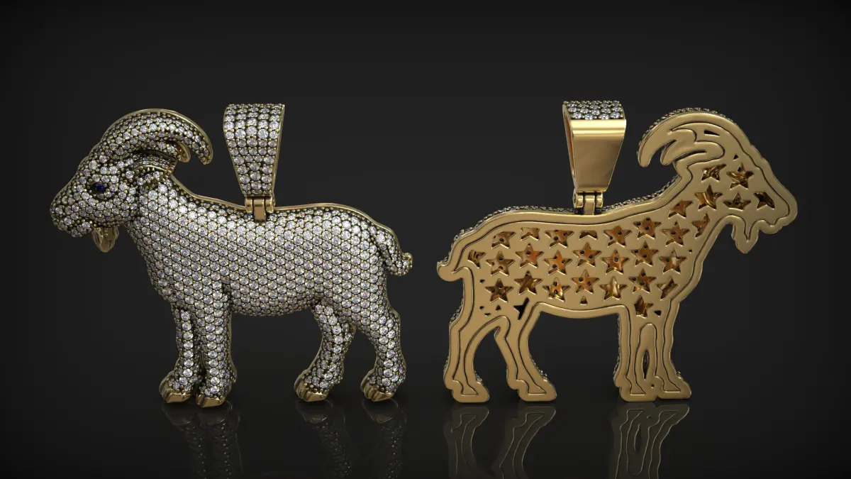 This highly detailed 3D model presents a luxurious goat-shaped pendant, perfect for fine jewelry design and 3D printing. The front side is fully encrusted with pavé-set diamonds, offering a dazzling and realistic gemstone effect. The eyes feature dark stones for added character and contrast. The back side showcases a polished gold surface with star-shaped cutouts, adding a unique and decorative pattern that maintains visual interest even when flipped.
