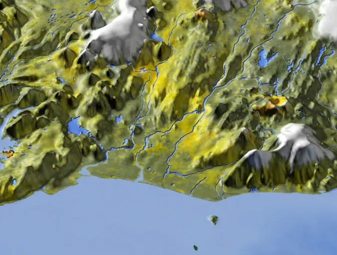 The 3D relief is taken from reprojected NASA shuttle radar topography data, with the elevation exaggerated. The 3D relief is baked into a 750x679 mesh with 1024258 polys, 513566 vertices (for the main map).