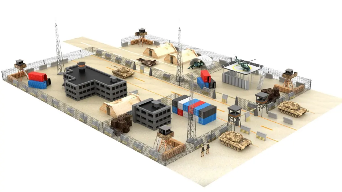 A military base with many objects. Military Base, Soldier, war, plane, Helicopter, Tank, military, tower, Container, Hangar.