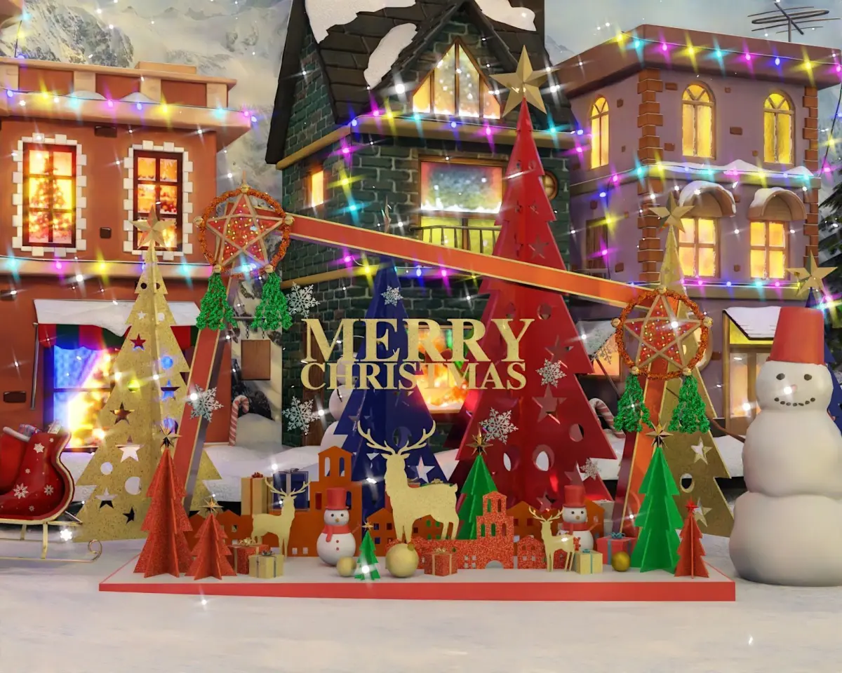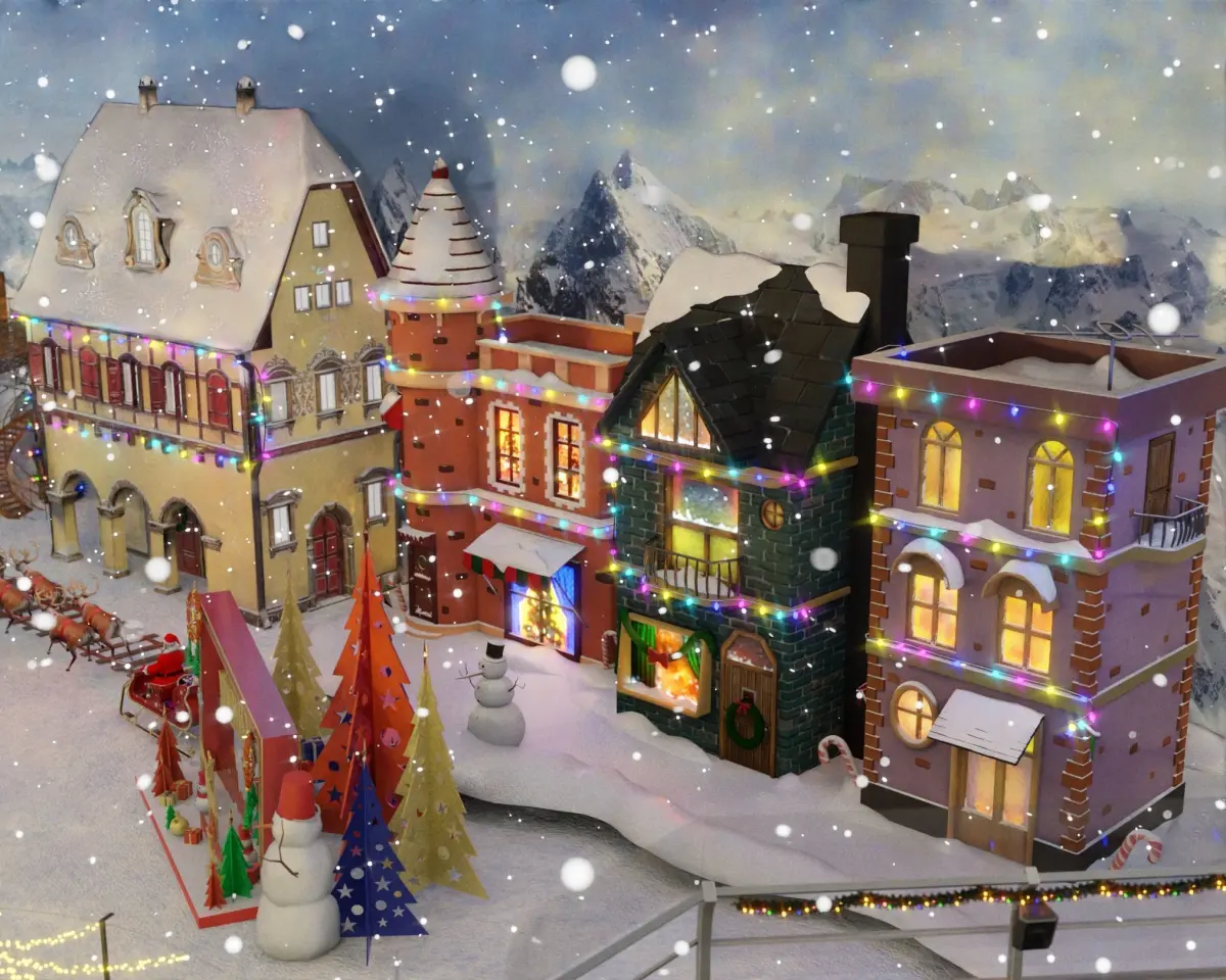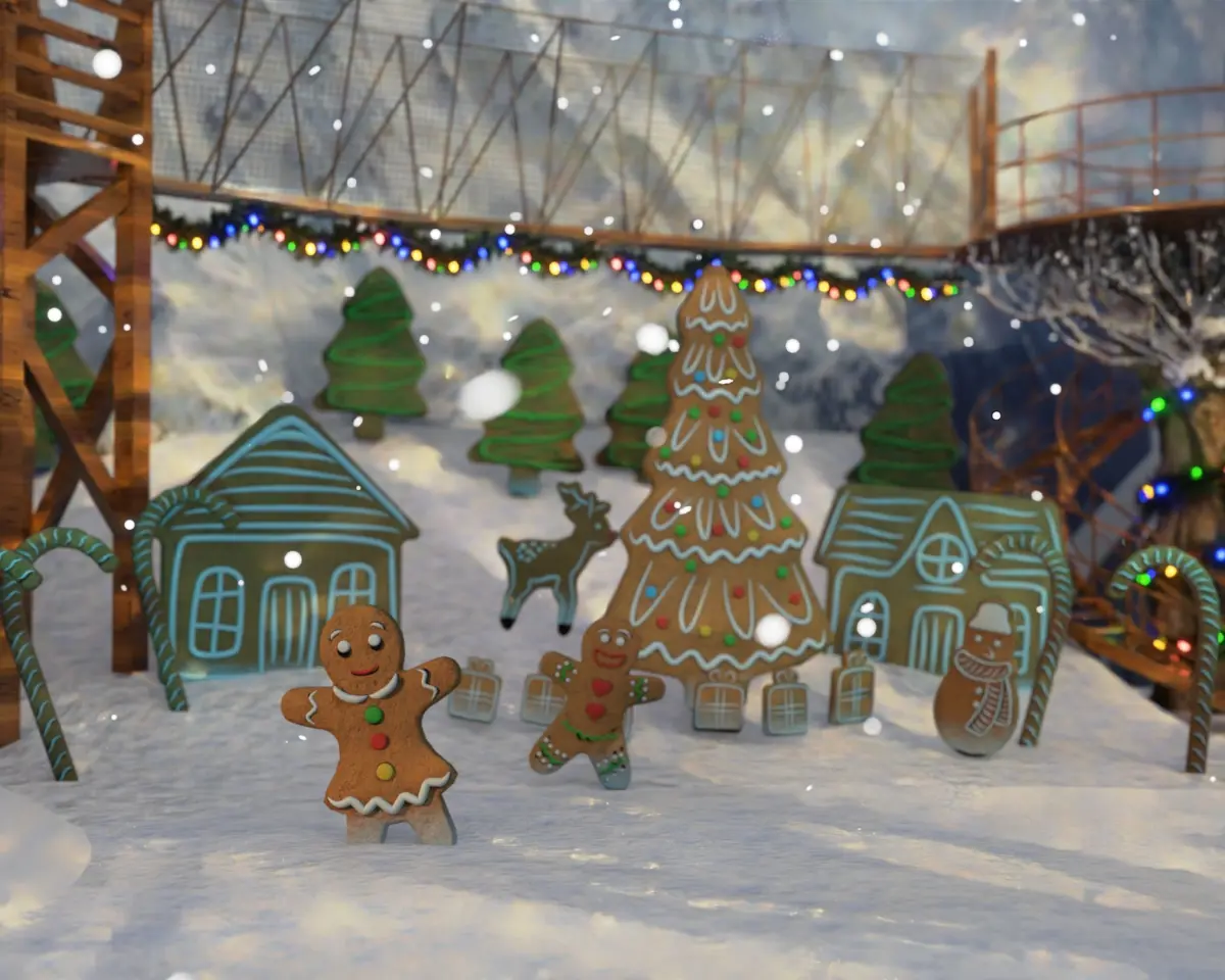 Some mesh have decimated modifier to lighten the viewport area but will not affect the appearance of some meshes on renders.Each With animated Snowfall using Blender Particles.