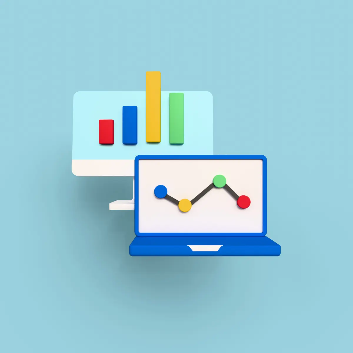 The image presents a set of 3D-style isometric icons related to data analysis, machine learning, and cloud computing. The icons are arranged in a grid on a light blue background, each representing different technological and analytical concepts.