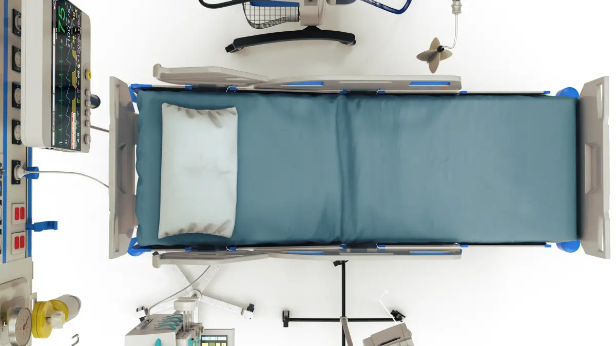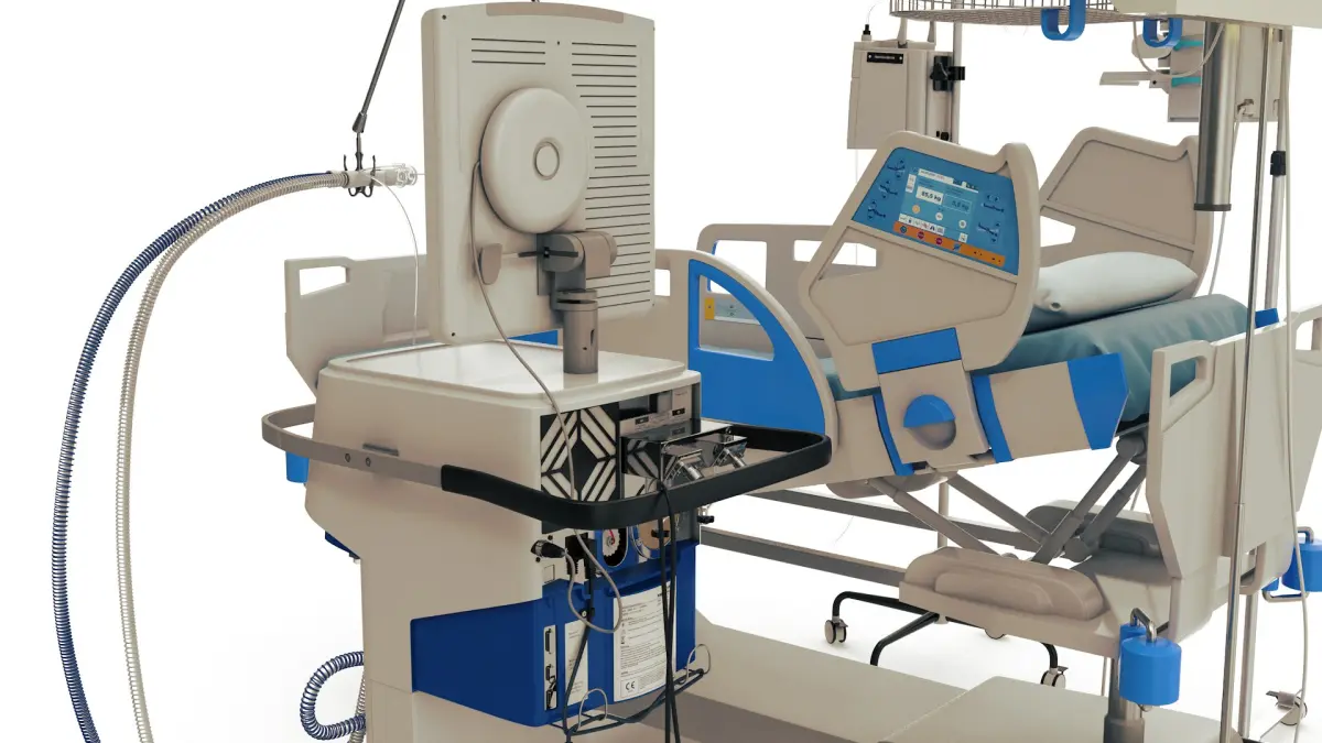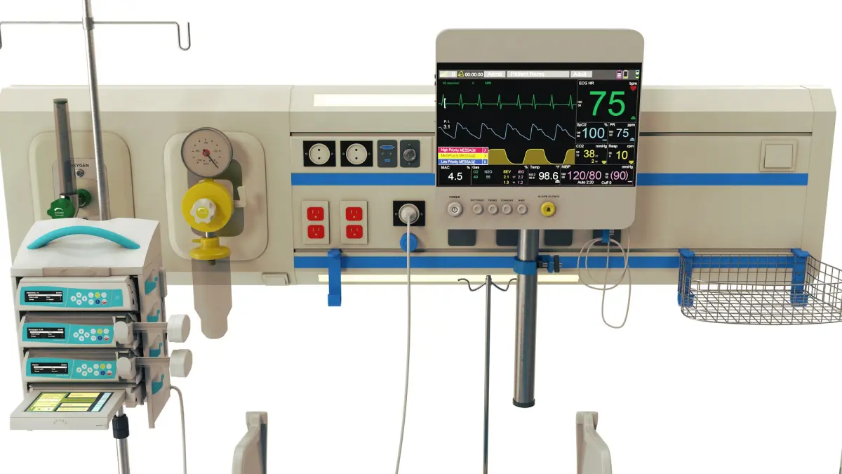 A highly detalied set of ICU equipment models. It includes a mechanical ventilator, an infusion pump, a headbed set, a medical bed and an IV stand.