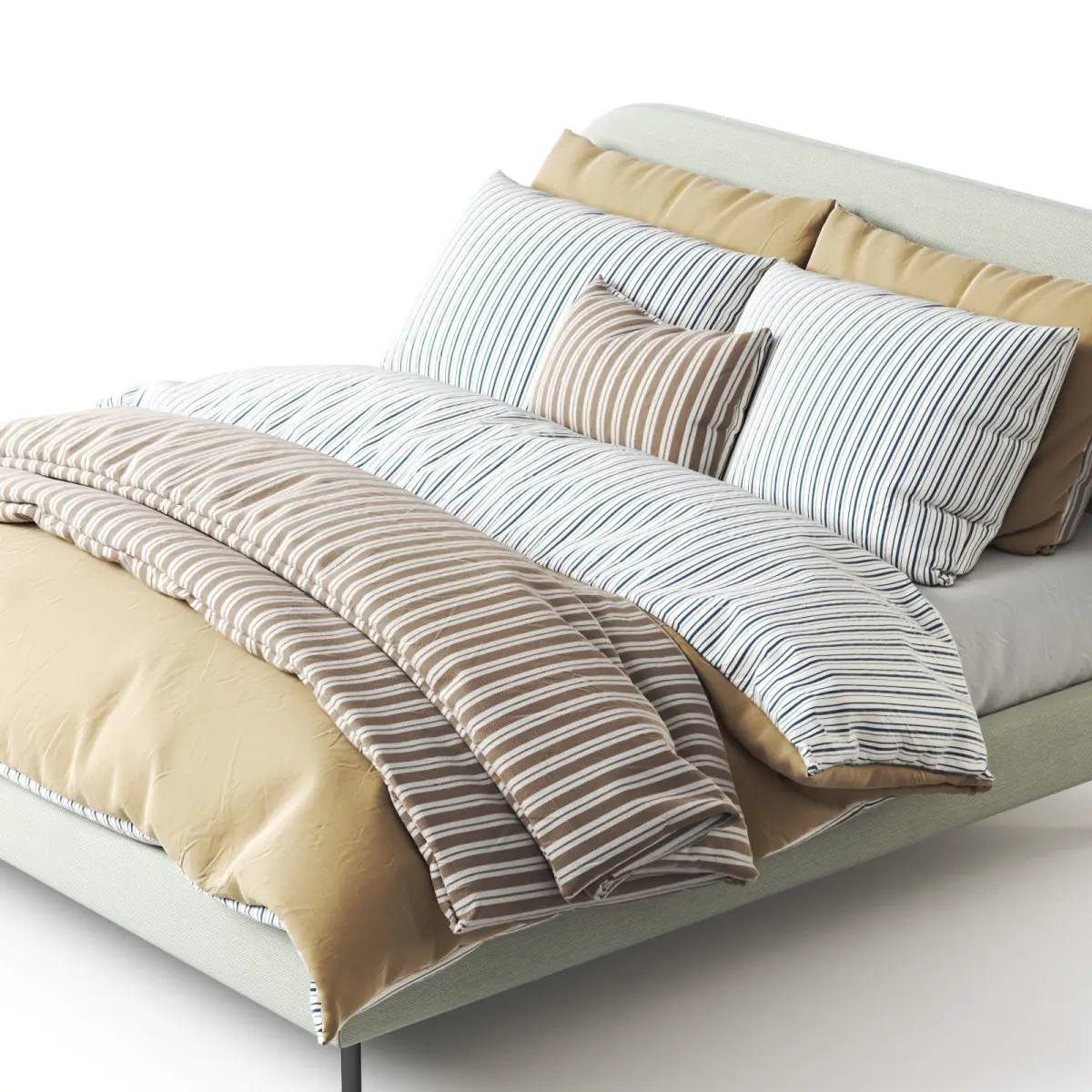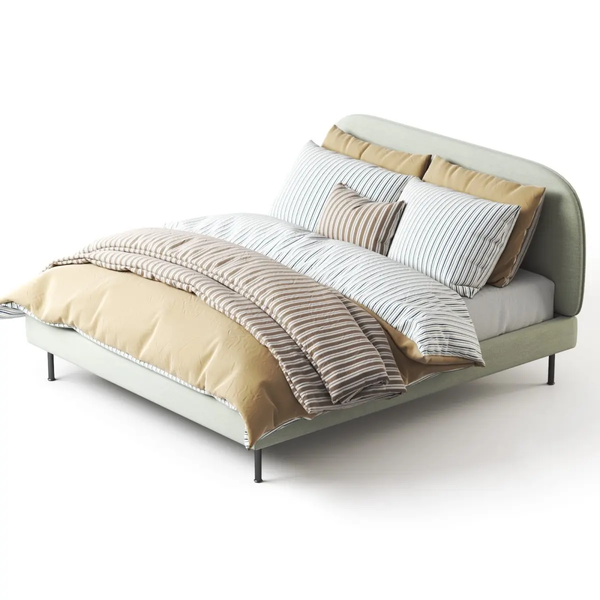 A bed with soft upholstery in a pleasant light green color will create an atmosphere of warmth and comfort in the bedroom. The laconic design and smoothly rounded headboard make the bed stylish and comfortable.