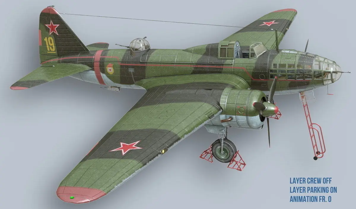 Ilyushin IL-4 was a long-range Soviet bomber of the WW2 era. 3ds Max-2016, render Corona, materials for Corona, textures 2K. Full historical reconstruction - exterior, full interior, crew. Animation - canopy, pilot hatch, bomb hatch, gears. All objects are separated by layers - look carefully at all attached renders, they are accompanied by comments - everything is clear there - how to manage layers, animation, etc.History: the main long-range bomber (it was also called DB-3, DB-3F) of the Soviet AF of the WW2.It was used as a standard bomber and as a torpedo bomber in naval aviation.