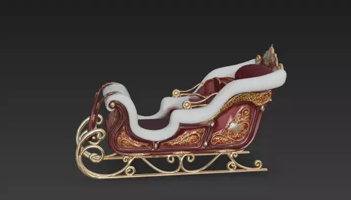 Gilded Scrollwork & Runners The metallic elements are not simple iron; they are plated in bright gold. The runners feature elegant curling designs, and the side panels of the sleigh are decorated with raised gold filigree (floral patterns), reinforcing the royal status of the vehicle.