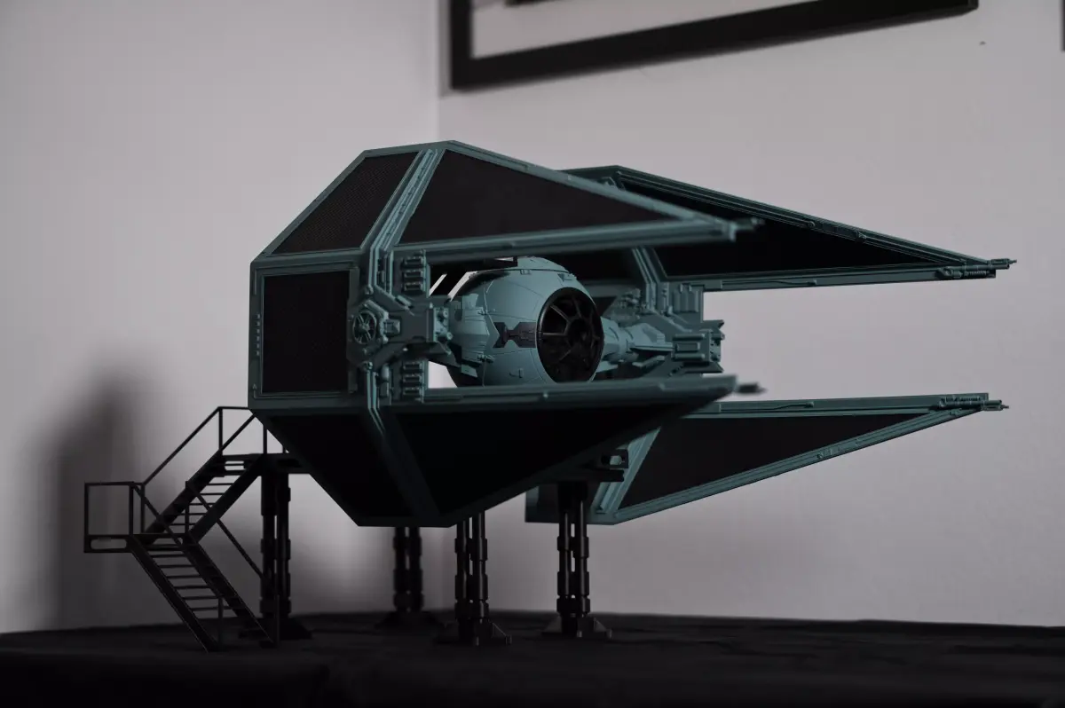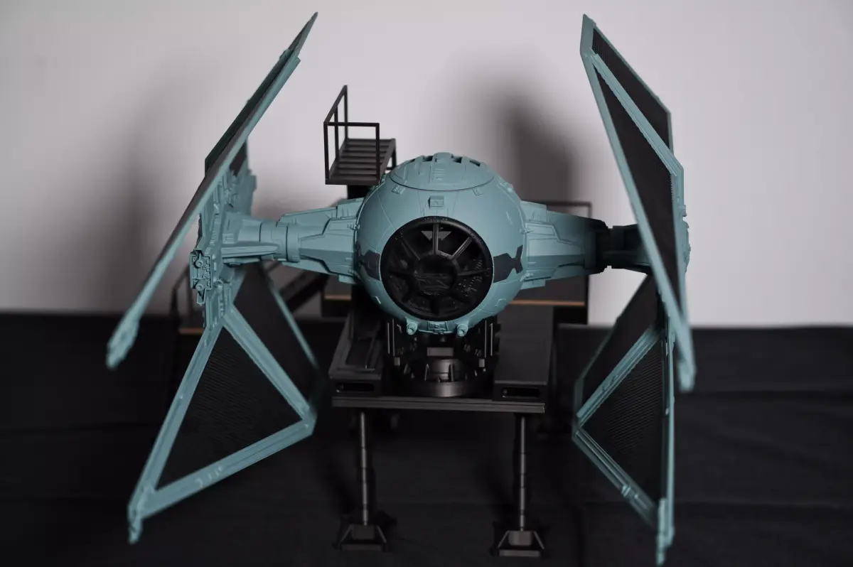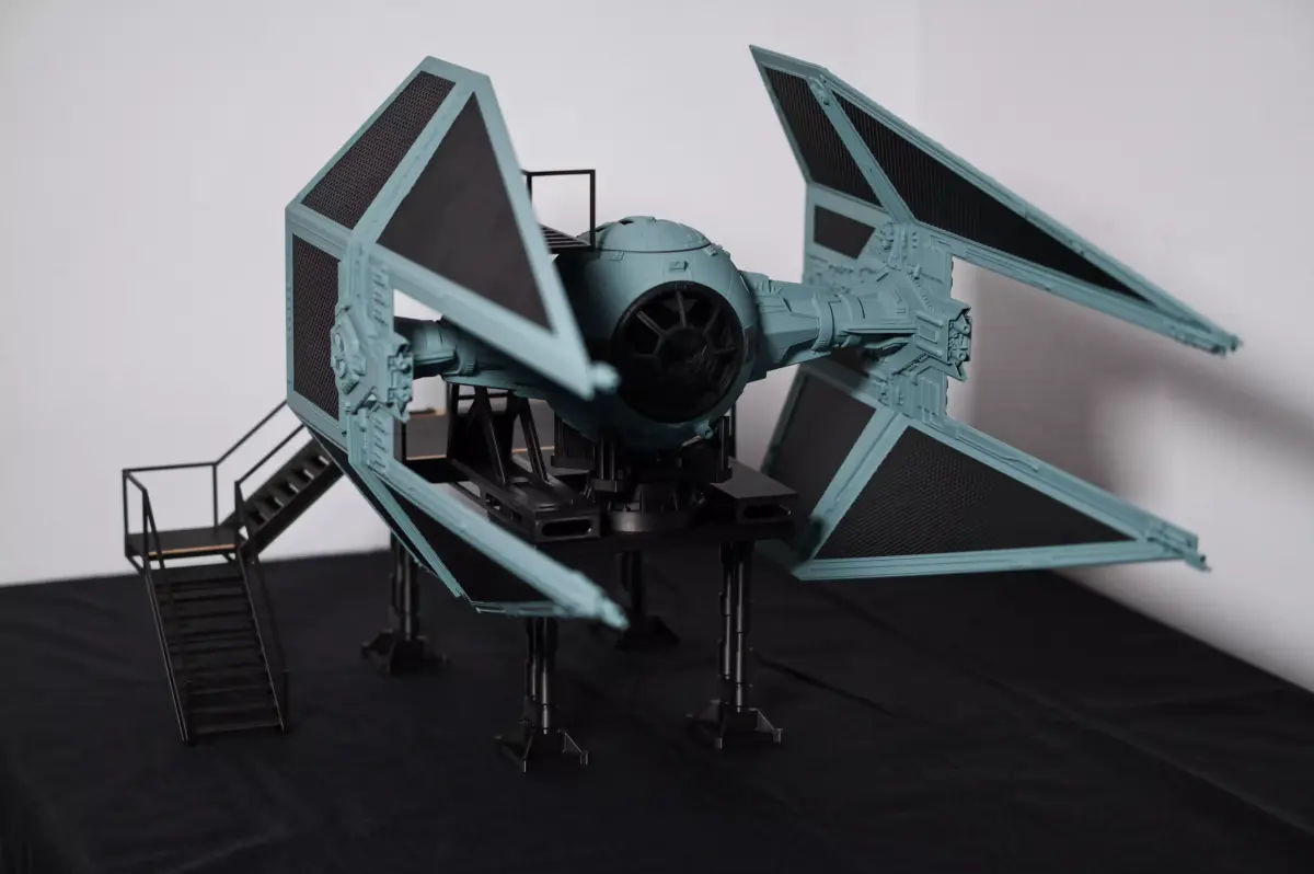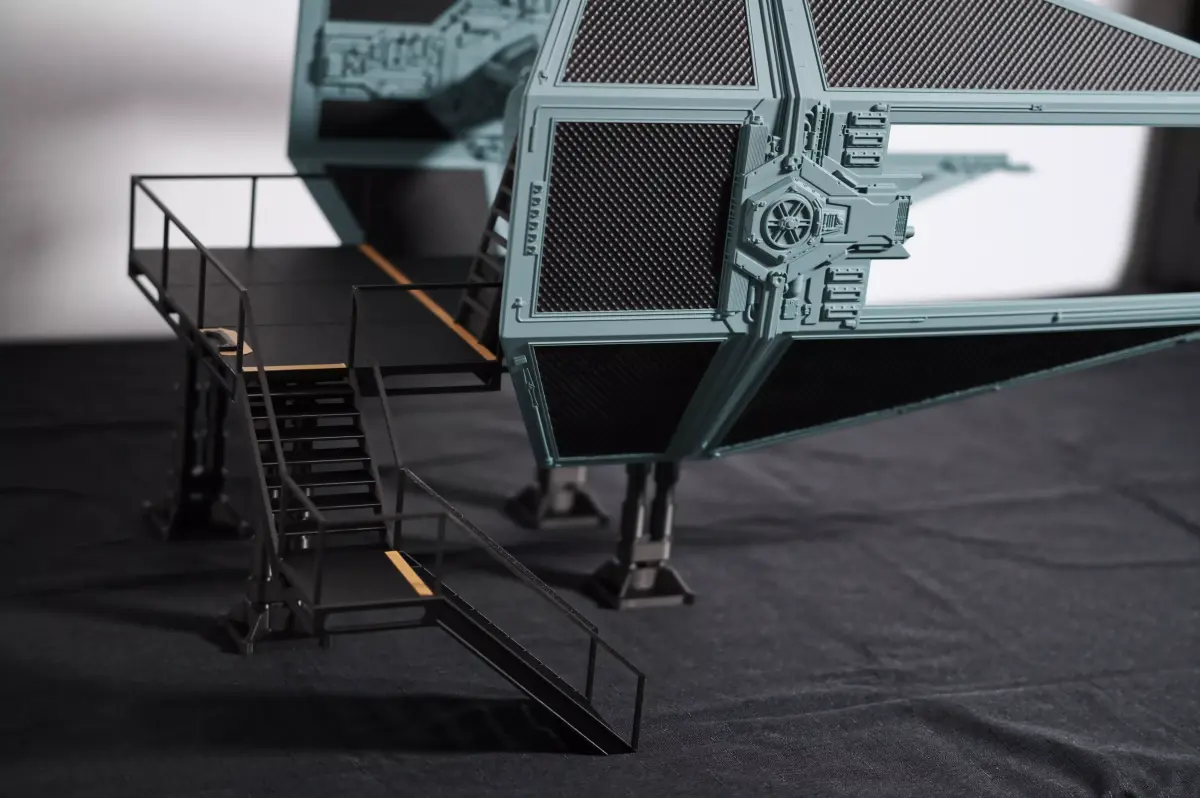 Upgrade your studio scale collection with this detailed 3D-printable hangar display stand, engineered to fit studio scale (1/24) TIE Fighters and TIE Interceptors (files for the ships are not included).