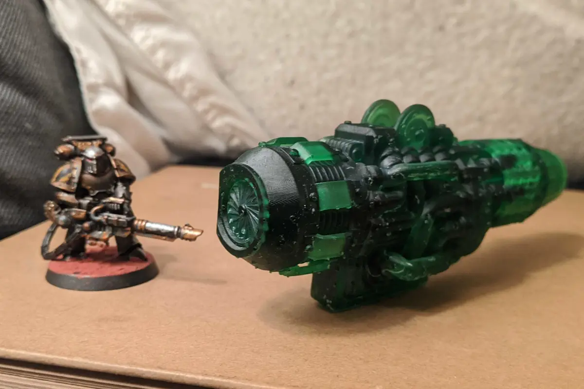Basically what the title says, it's a thermal cannon count-as modelled off a rough approximation of a jet engine, compatible with GW's plastic knight range. Includes a left-side panel version, a right-side panel version, and a bare piping version. One solid piece, I printed mine at a 45 degree angle in an Anycubic Photon. I recommend a lot of supports, it's a hefty one. I got pretty good results with auto supports with the settings: 5% heavy, 15% medium, 25% light. Contact me me you have any questions, happy to help!