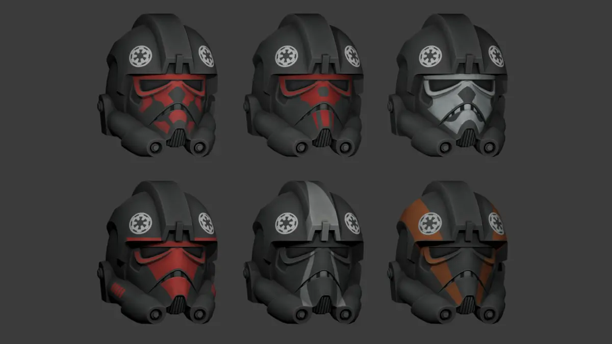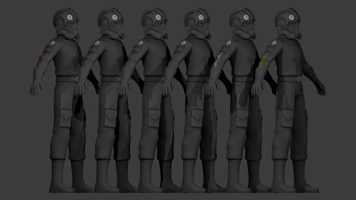 Imperial Pilot 3D ModelA detailed 3D model of an Imperial Pilot from the Star Wars universe, created in a stylized Bad Batch/Clone Wars art style. The model includes multiple uniform color options and various helmet decal variations for customization. Suitable for use in games, animations, or promotional materials. Clean topology and optimized for real-time rendering.