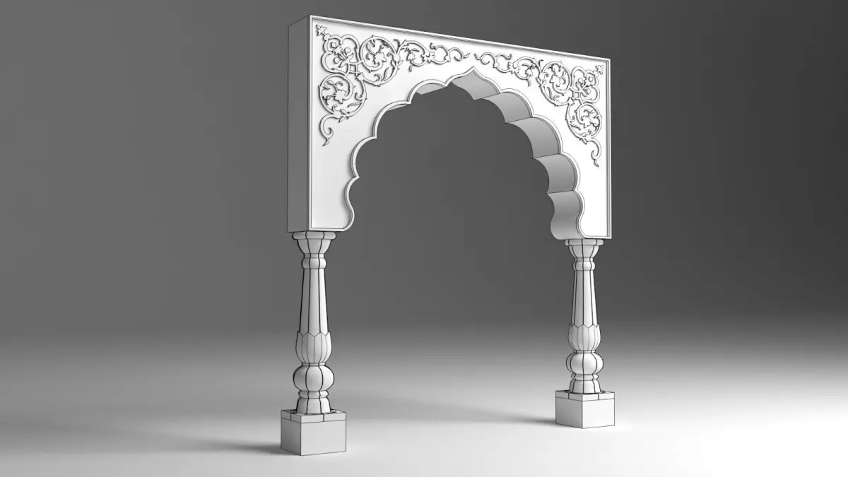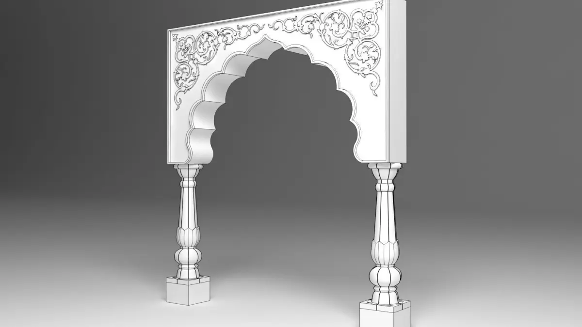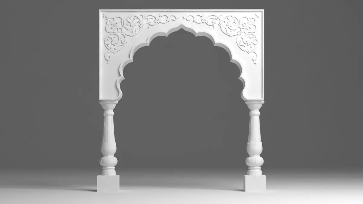 The Indian Arch is a beautiful representation of traditional Indian architecture, often seen in historical buildings, temples, and palaces. This 3D model features a delicate blend of intricate patterns, graceful curves, and a strong cultural design influence. The arch is designed with a semi-circular shape or pointed form, with decorative detailing along the edges, such as floral motifs, geometric patterns, or ornamental carvings.