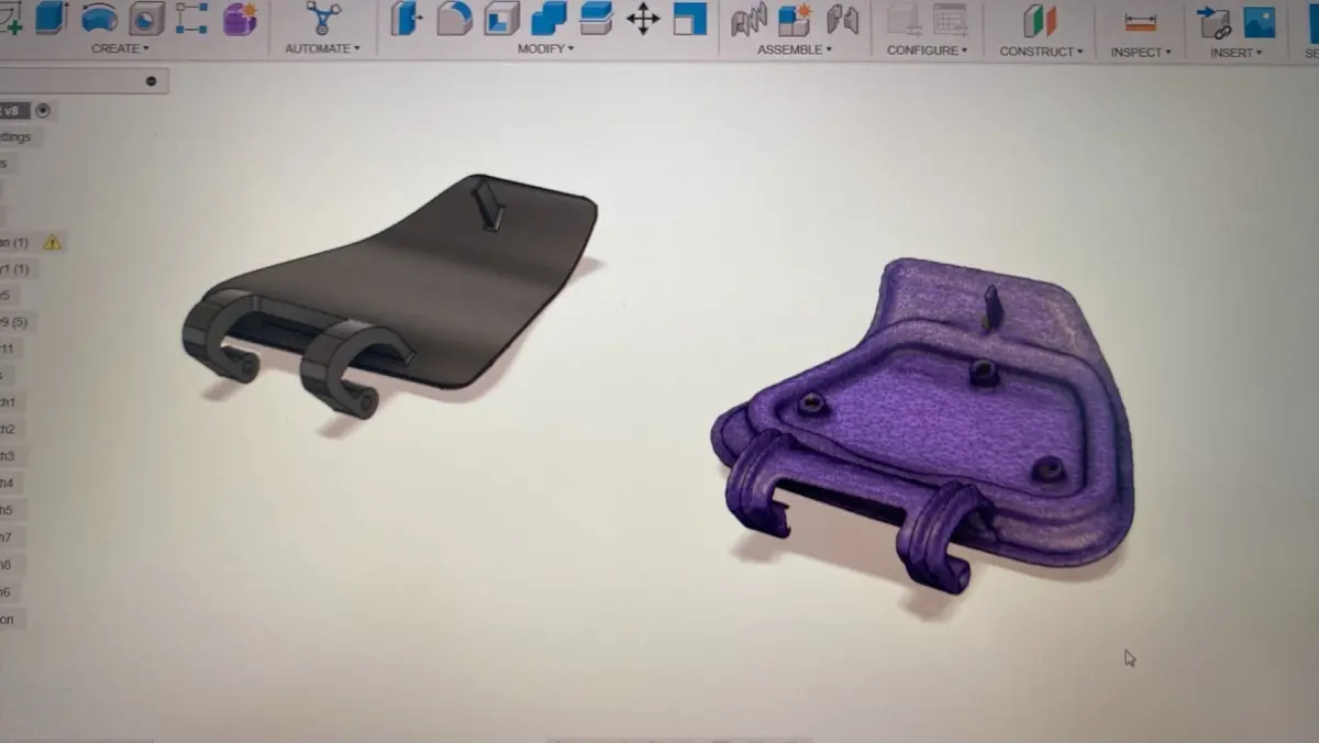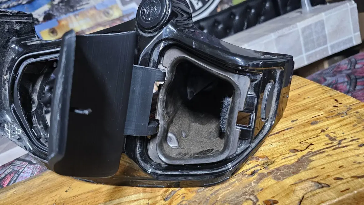 I scanned the original glove box door for the Indian Challenger and cleaned up and processed the scanned model. After reverse engineering, I prepared the model for 3D printing. I then created a mirrored copy of the original and printed it. The printed part fits perfectly, closes smoothly, and the latch snaps securely into place. The glove box closes seamlessly, and the snap mechanism locks perfectly. With some sanding and spray paint, it is not noticeable that this is not the original part.I designed the door as a single part. In practice, you will receive this part, which includes the mechanism with the hinges, and the other part that serves as the cover.