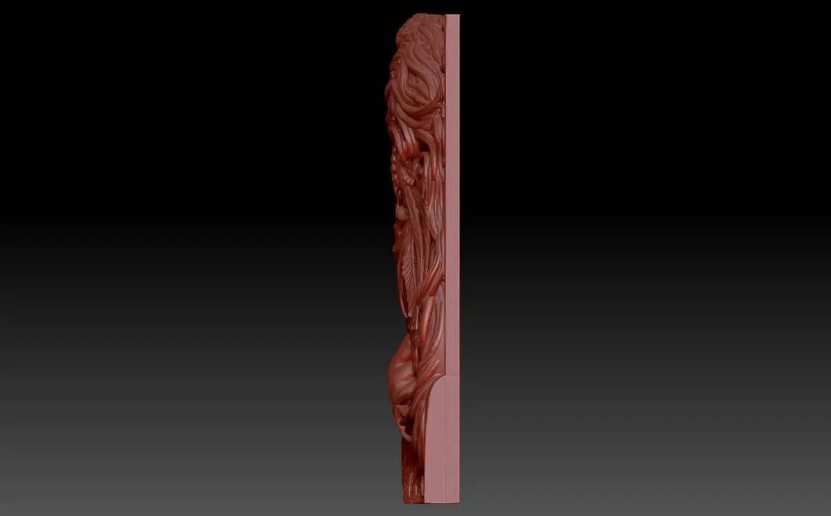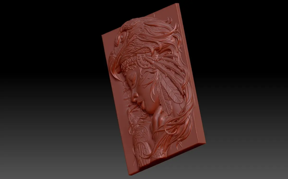 A 3D model of a bas-relief depicting an Indian girl . The girl is depicted in profile with her eyes closed. The landscape, part of the mountains and the sky are depicted in the background. She has eagle tattoos on her body. The woman's hairstyle has attributes such as eagle feathers and more.