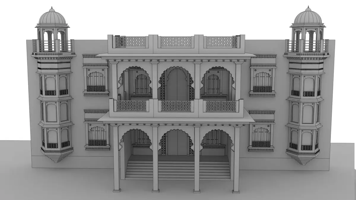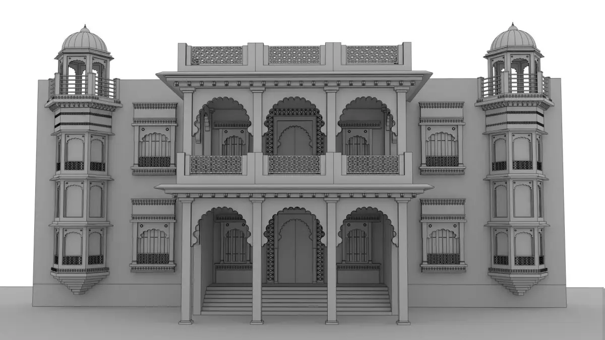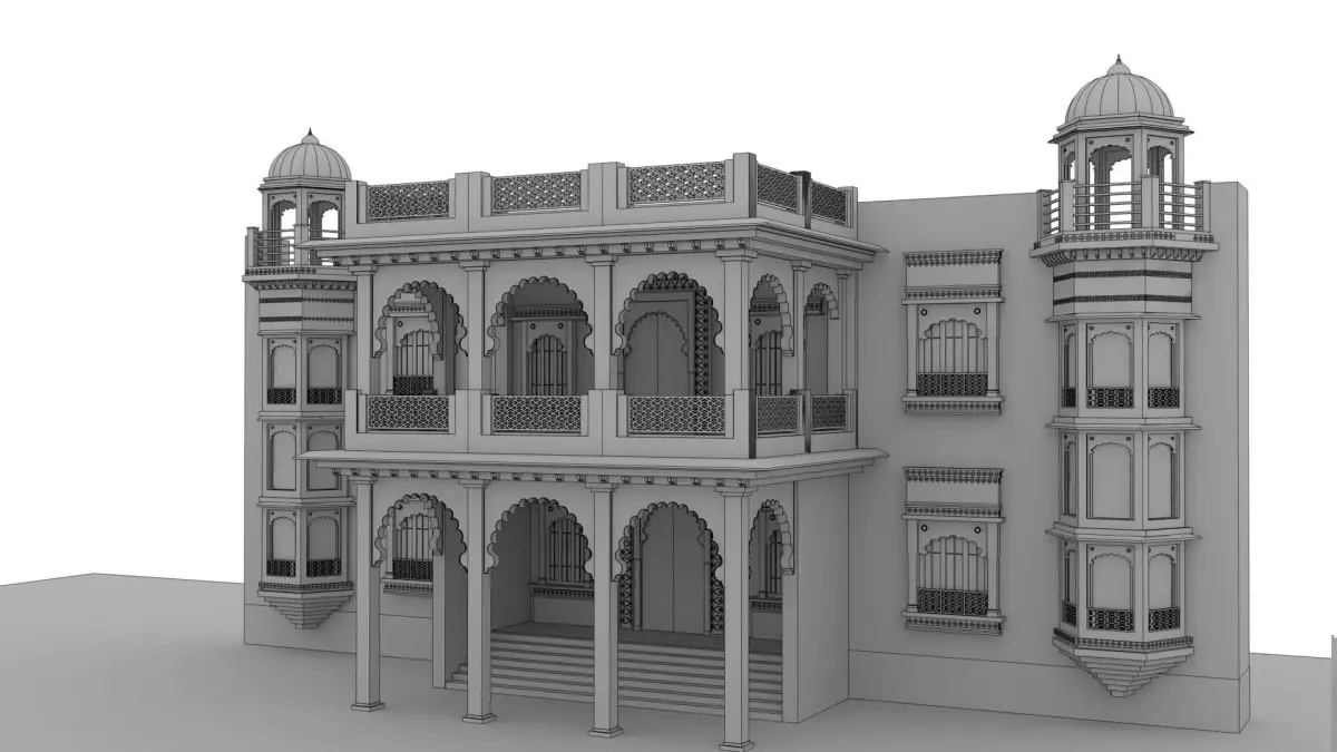 Indian palaces often feature large domes, ornate arches, carved pillars, and decorative jali (lattice) work, which add elegance and visual depth to the structure. The architecture is usually a blend of Rajput, Mughal, and traditional Indian styles, showcasing symmetry, balance, and elaborate ornamentation. Beautiful courtyards, grand entrances, and expansive halls are common elements that enhance the palace’s royal appearance.
