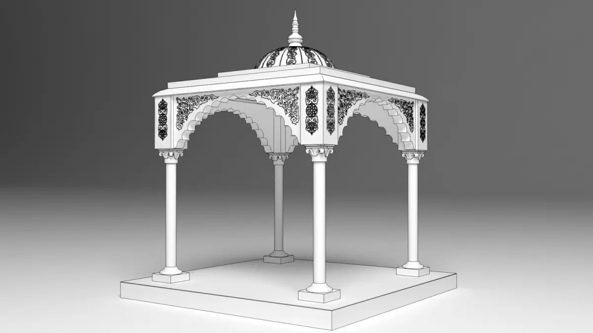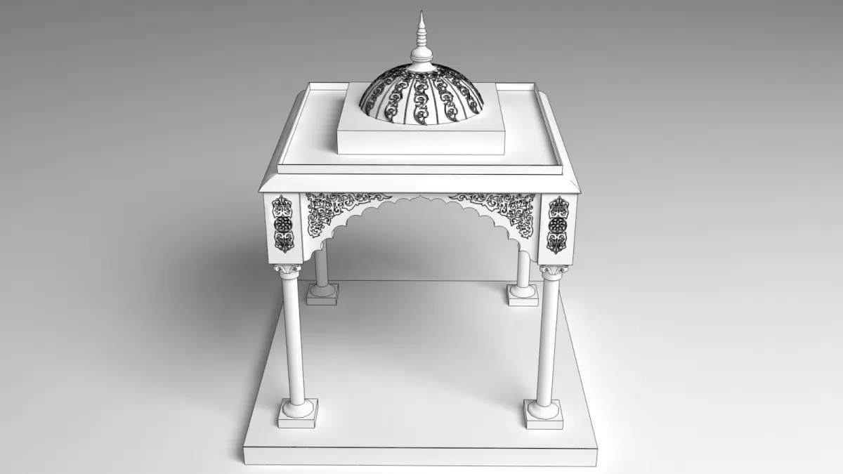 This intricately designed 3D model represents a traditional Indian palace canopy, often seen in royal courtyards and ceremonial pavilions. Inspired by Mughal and Rajasthani architecture, the canopy features elegant carved columns, a domed or chhatri-style roof, and detailed ornamental motifs that reflect the grandeur of Indian royal heritage.