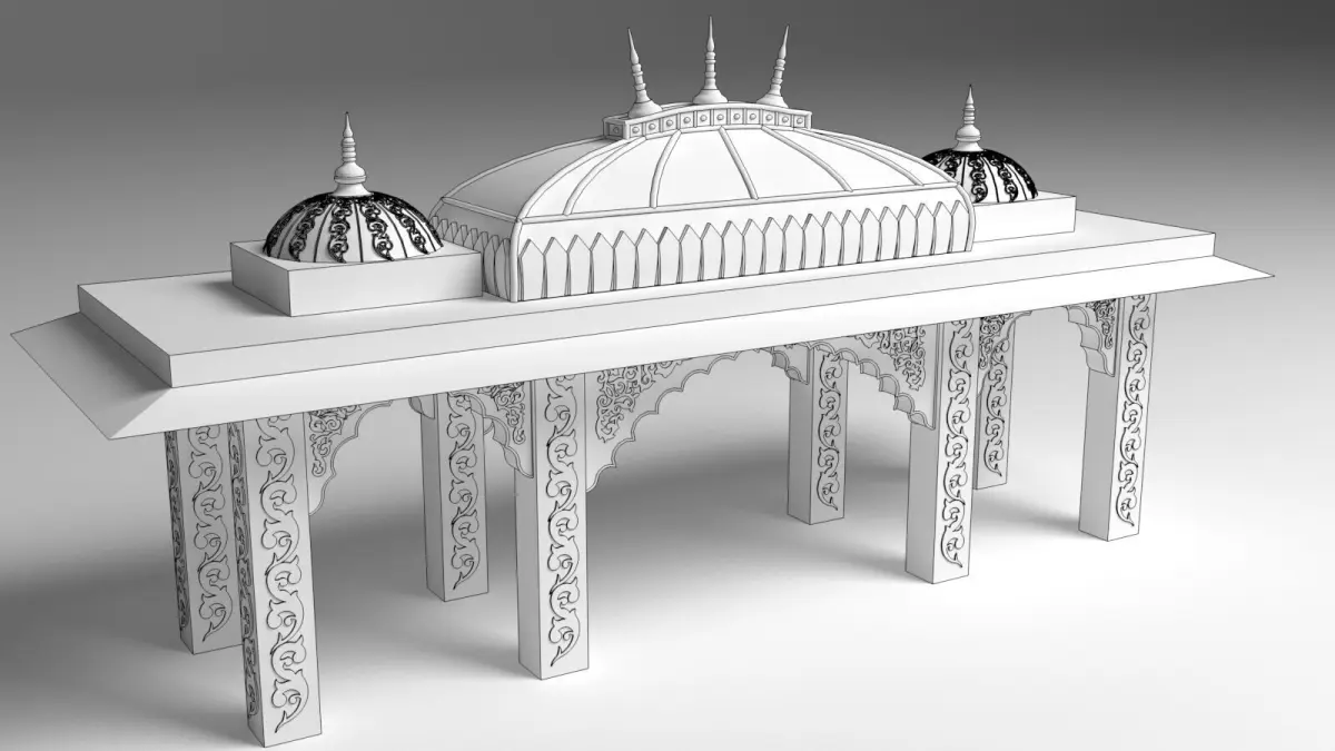 This intricate 3D model of an Indian Palace Porch showcases the grandeur and architectural elegance characteristic of traditional Indian palaces. The design captures a harmonious blend of ornate detailing, historical elements, and cultural aesthetics.