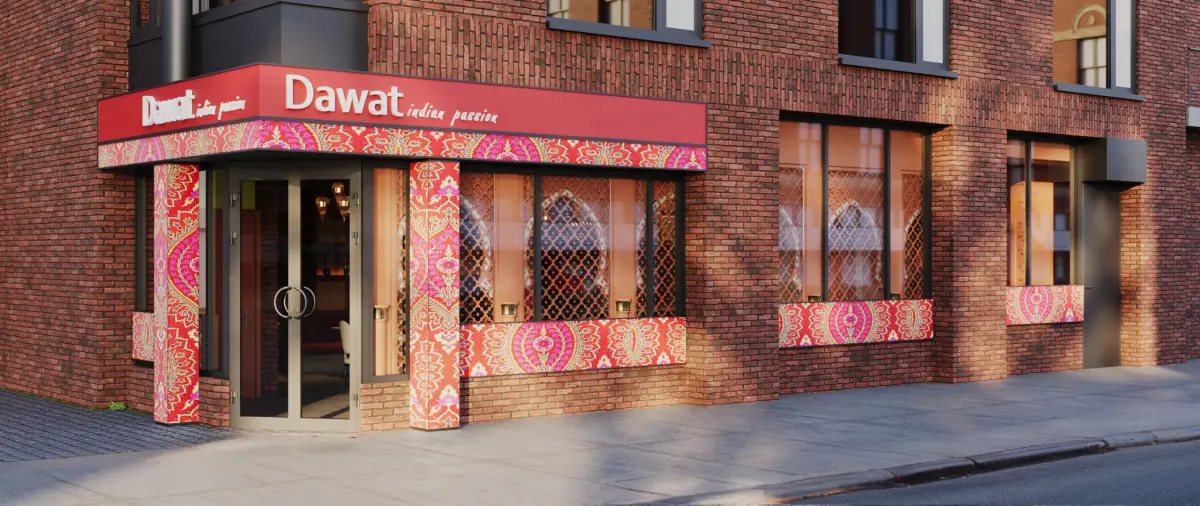 Exterior View:The facade boasts authentic red brick with vibrant Indian-patterned wraps around windows and doors. Bold signage makes it ideal for a restaurant branding or identity concept.