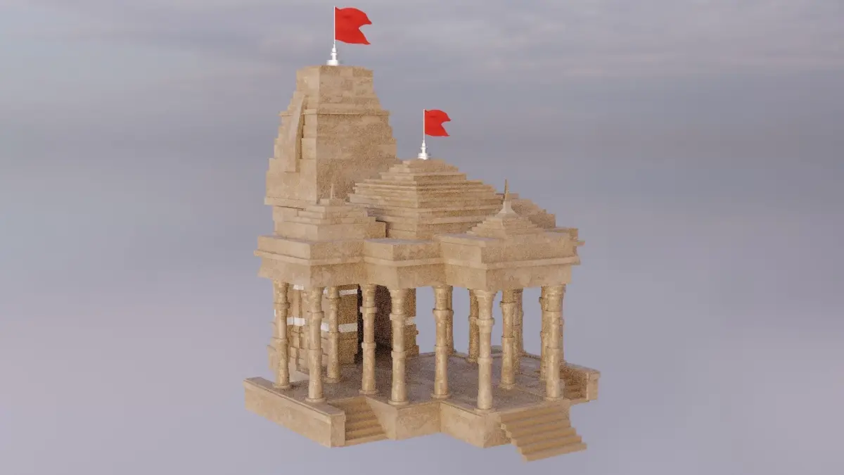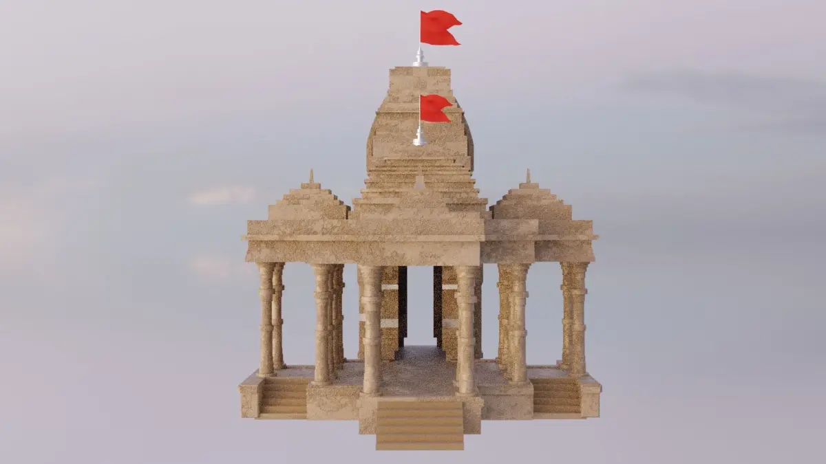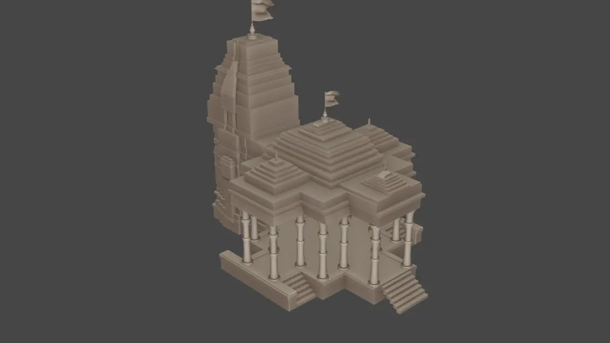 This 3D model is a representation of a mandir temple, a sacred place of worship for Hindus. A mandir temple is a house, seat and body of divinity, where human beings and gods come together through worship, sacrifice and devotion
