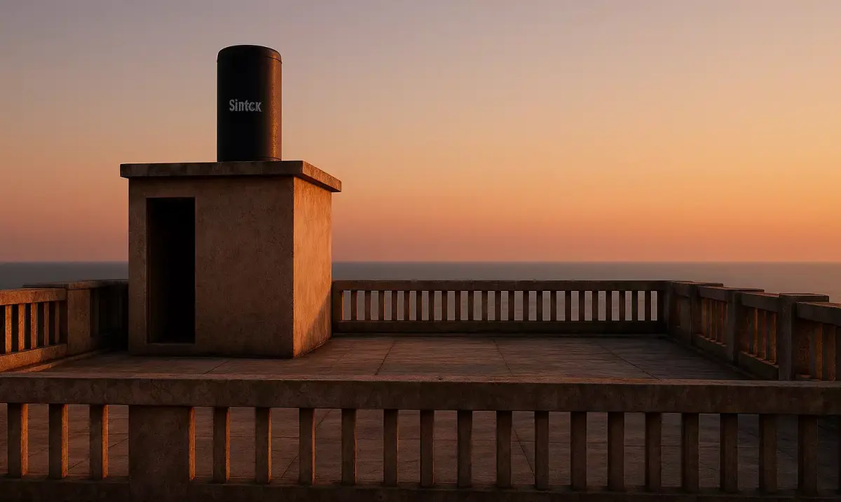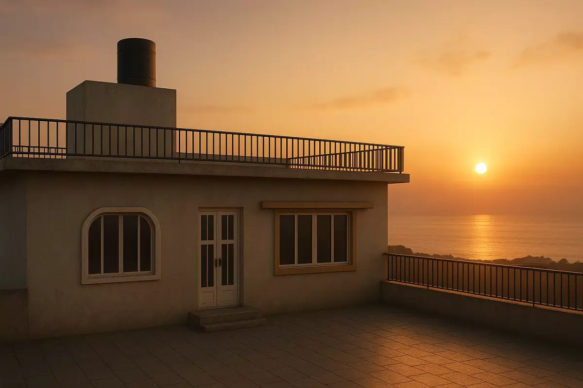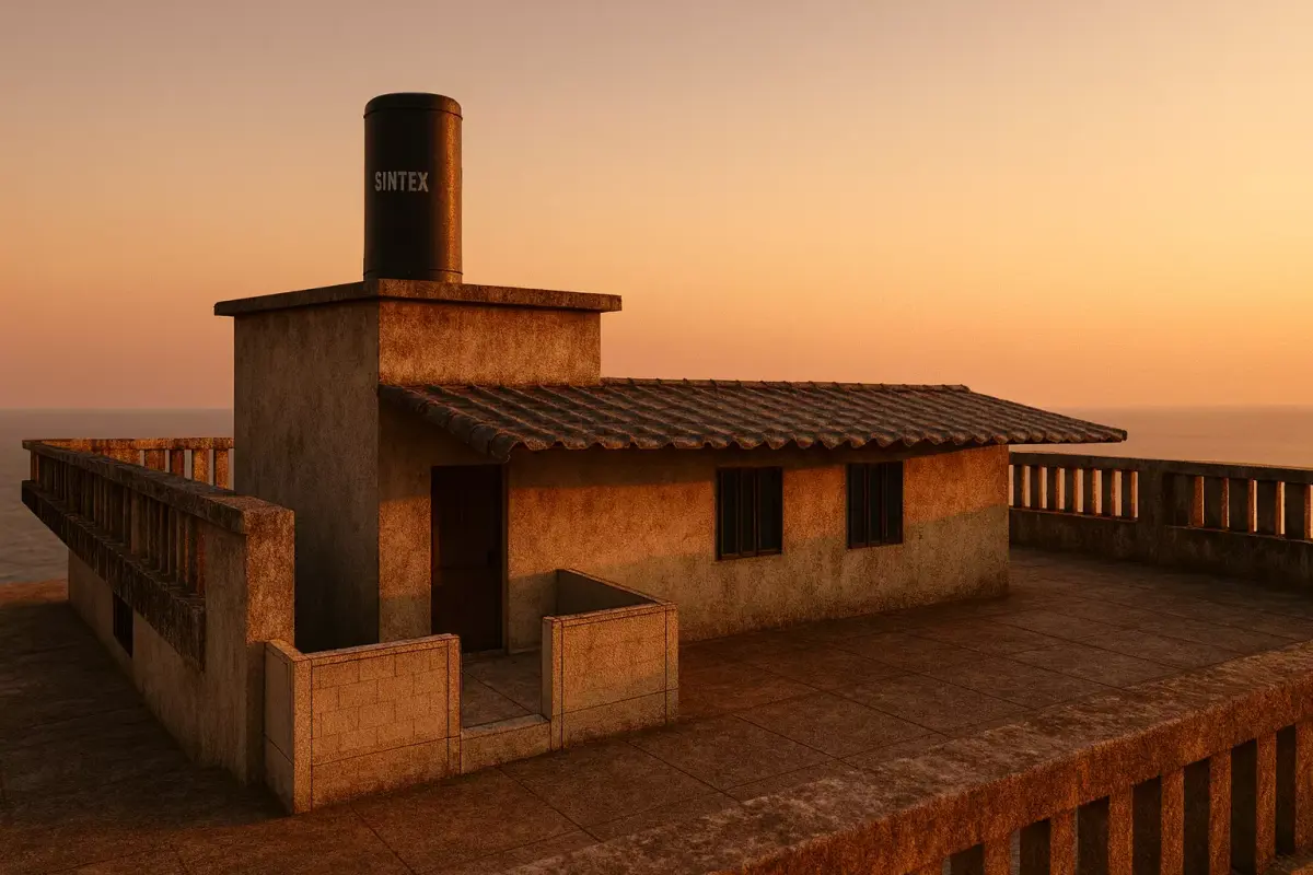 The environment features a concrete rooftop, boundary railings, a utility room with a corrugated roof, tiled flooring, and a water tank, all enhanced with sunset lighting to create a cinematic and realistic mood.
