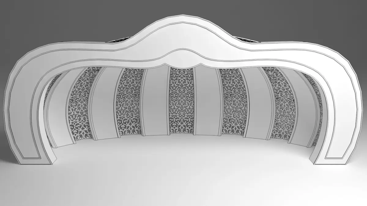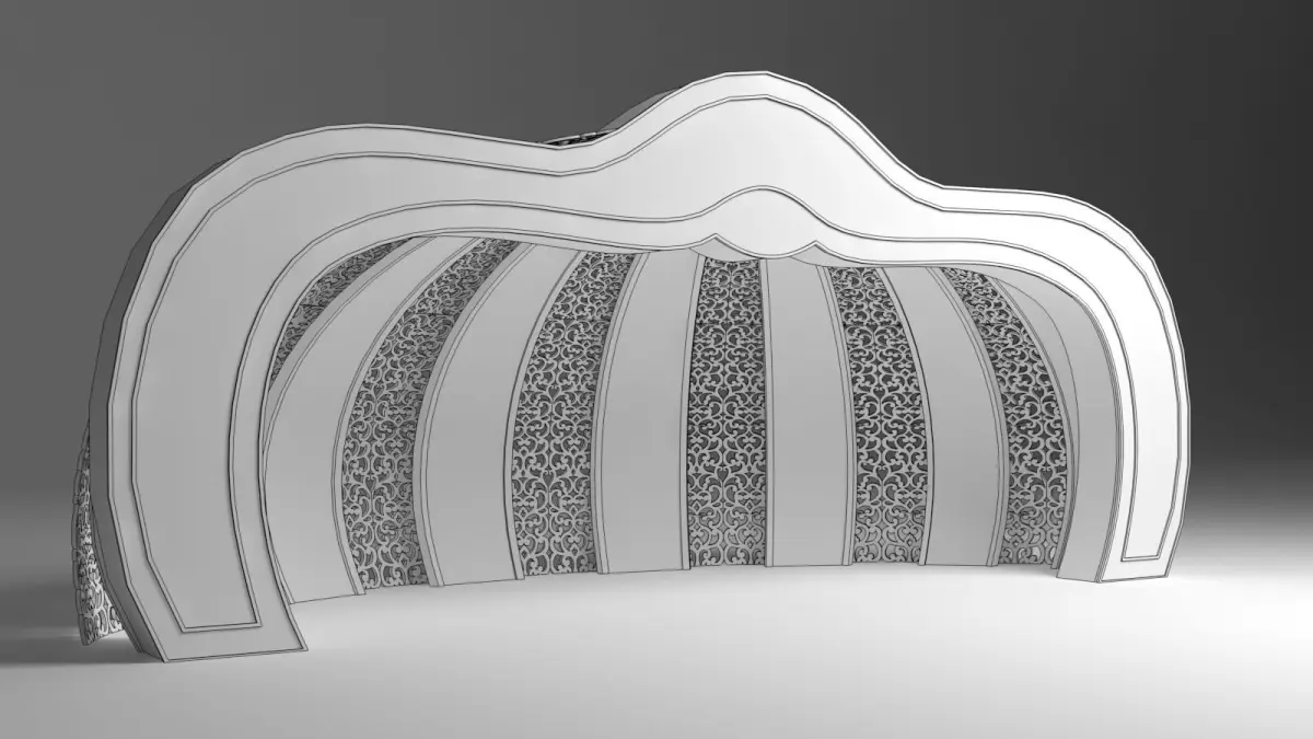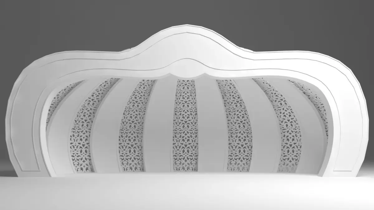 The wedding stage 3D model is a meticulously crafted digital representation designed to bring elegance and sophistication to any virtual wedding scene. The stage is set against a grand backdrop, featuring intricate floral arrangements that cascade from the top, creating a lush, romantic atmosphere. Delicate fairy lights are interwoven among the flowers, casting a soft, enchanting glow over the entire stage.