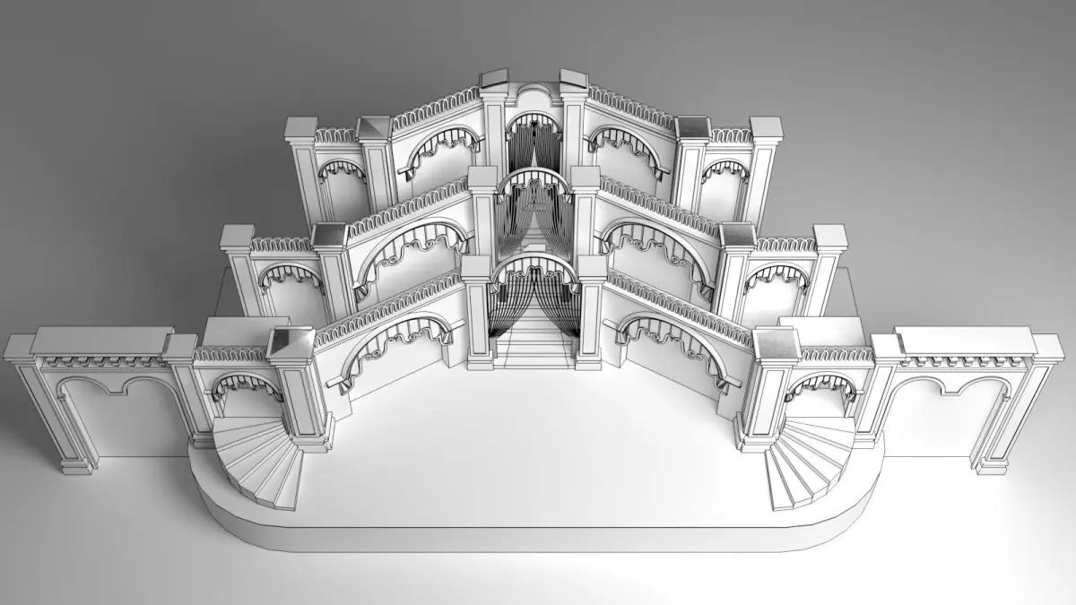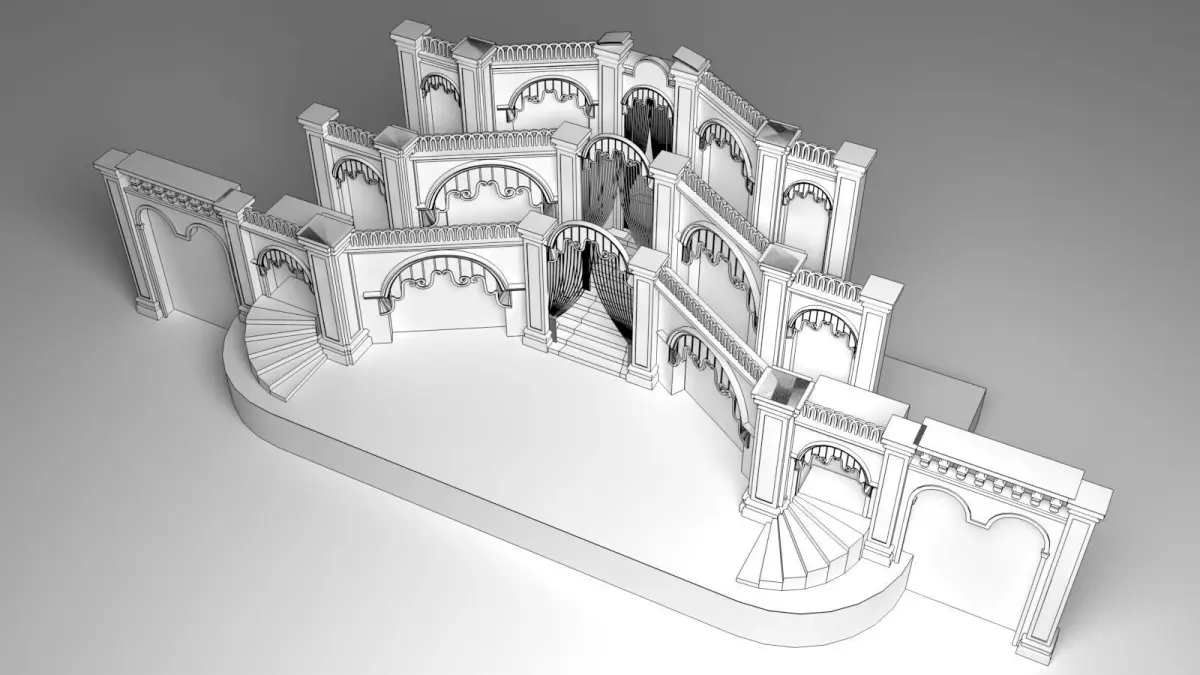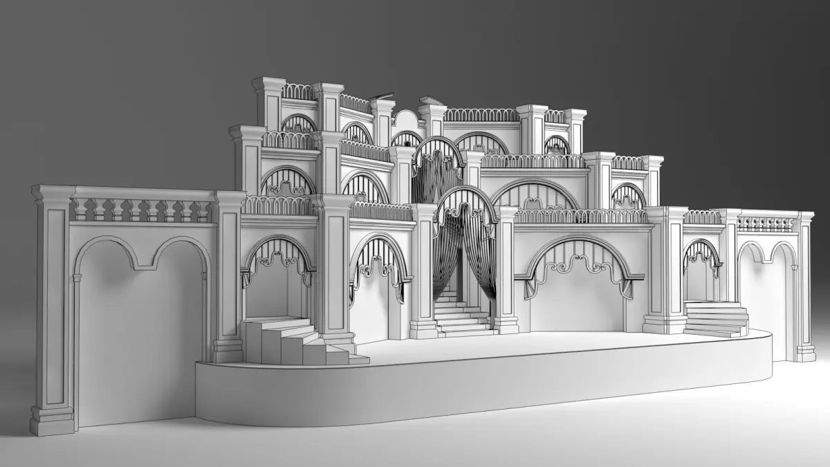 The wedding stage 3D model is a meticulously crafted digital representation designed to bring elegance and sophistication to any virtual wedding scene. The stage is set against a grand backdrop, featuring intricate floral arrangements that cascade from the top, creating a lush, romantic atmosphere. Delicate fairy lights are interwoven among the flowers, casting a soft, enchanting glow over the entire stage.