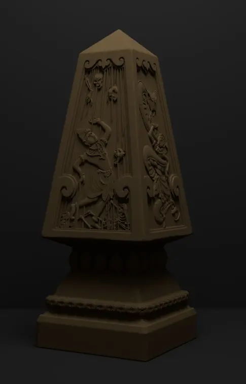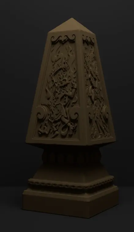Obelisk seen in the que line for the Adventure Ride in the Temple of the Forbidden Eye. Design is based more closesly on the concept art. Ideal for a table top diplay. Obelisk is clean (ie smooth). Cracks and texture are not modeled into the final design. They can be added by you during finishing.