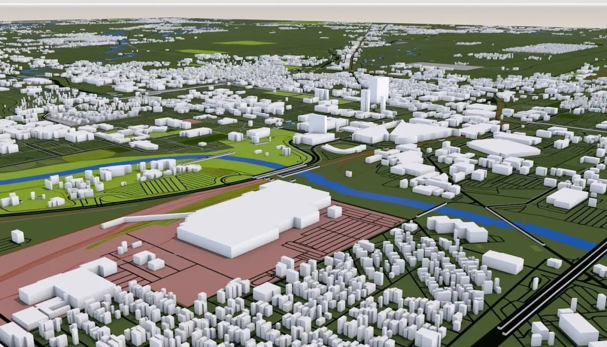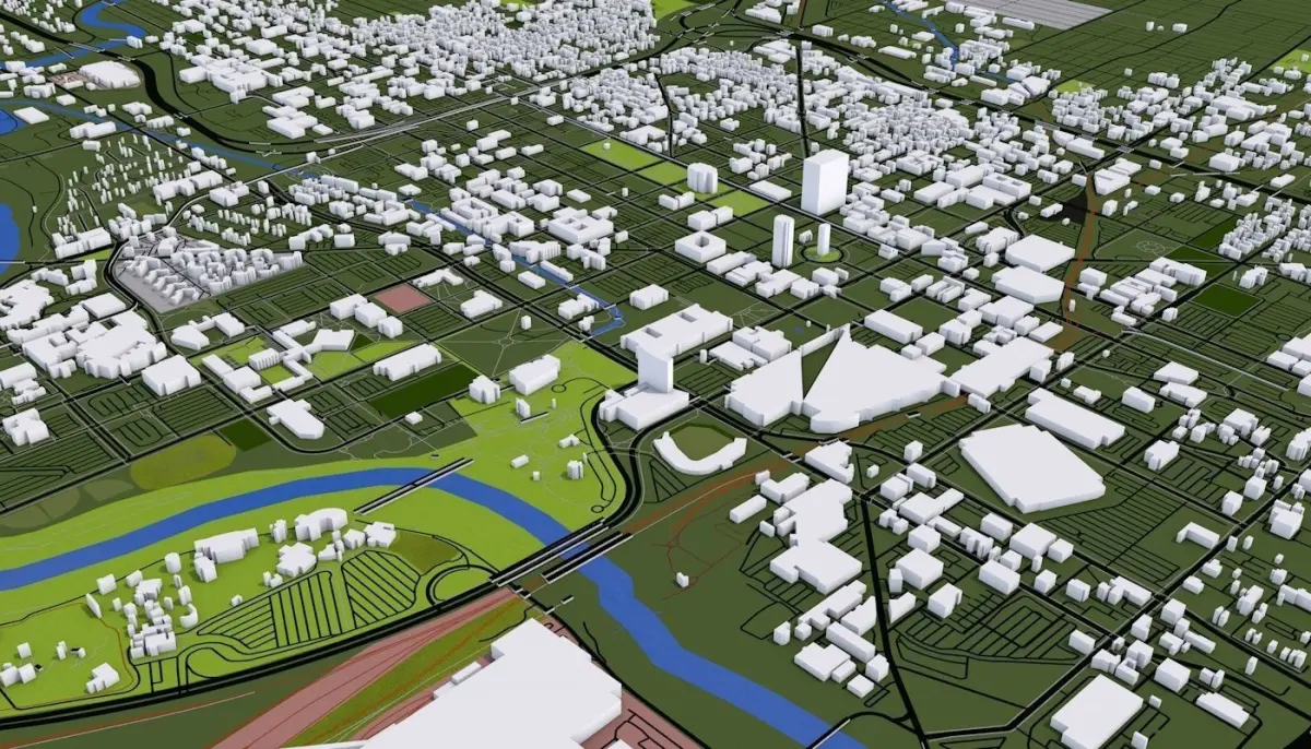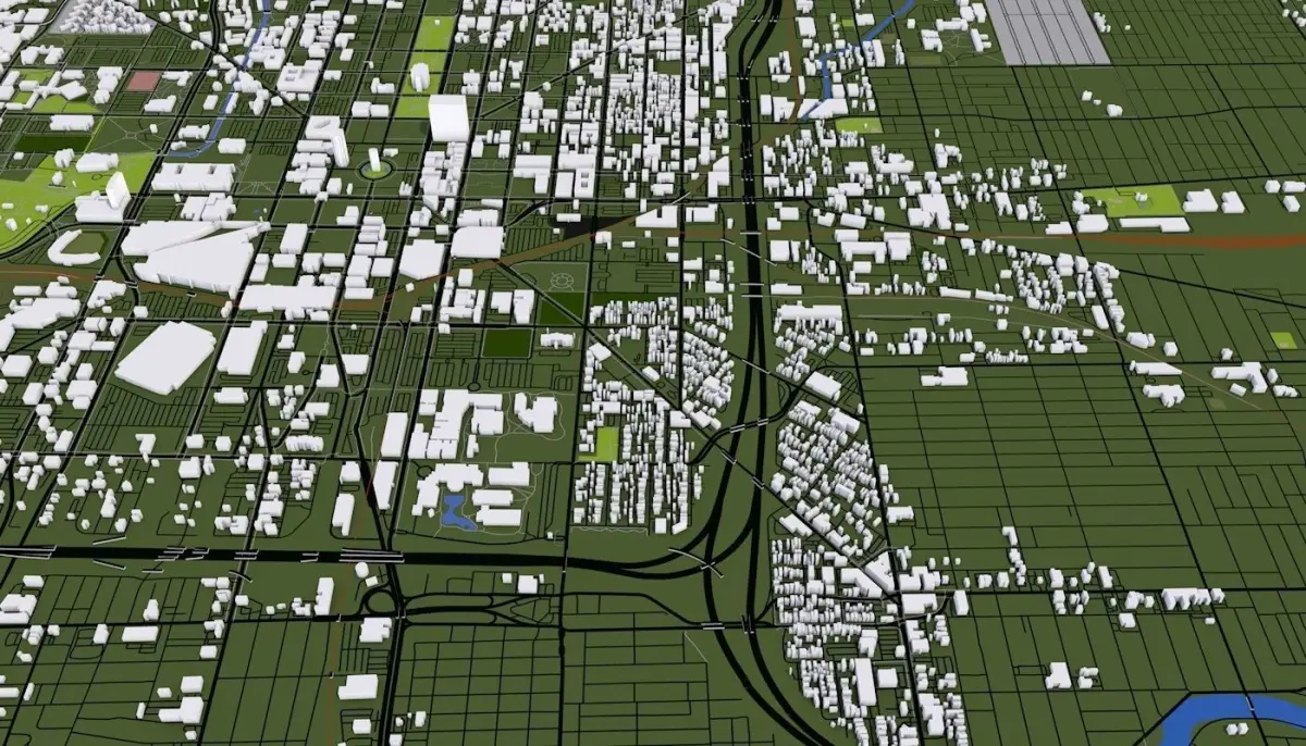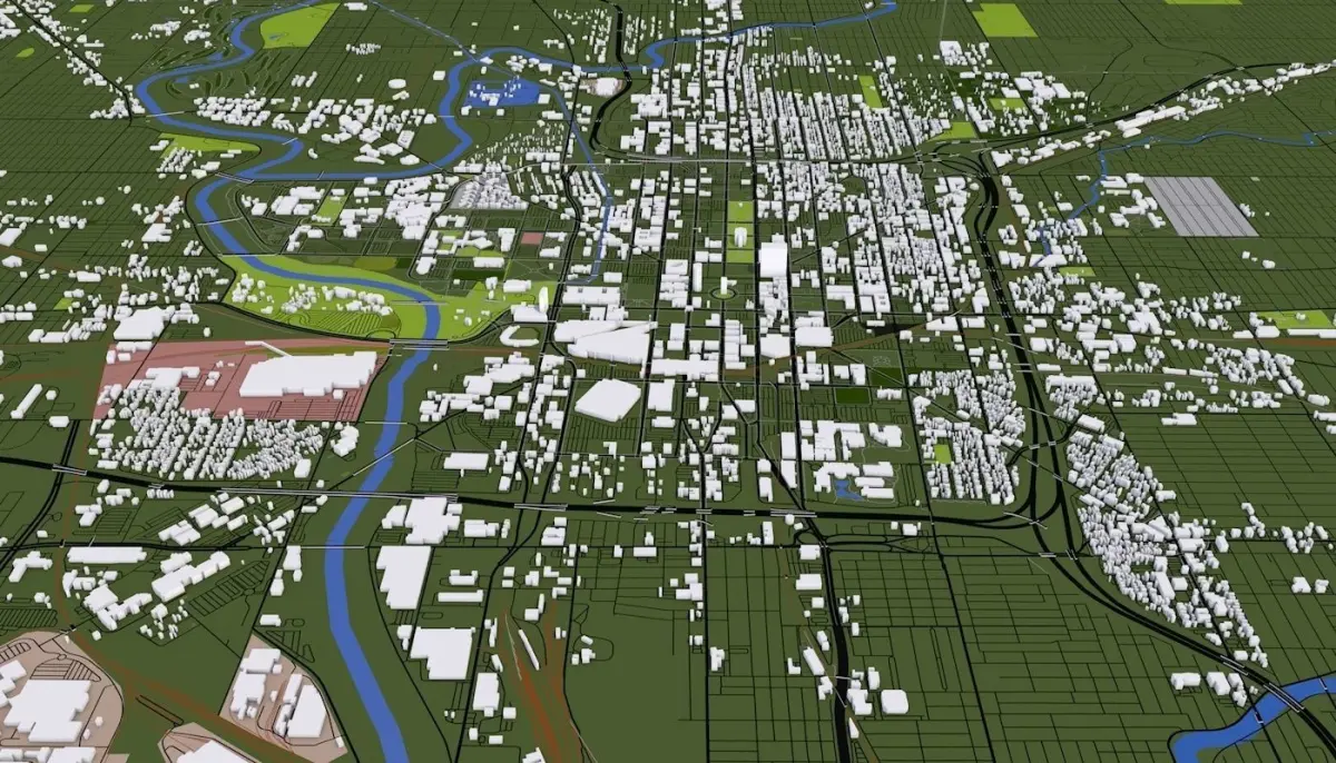 3D representation of Indianapolis City USA using 2019 map data. Roads, railway, land, water, buildings are made using real world data. Buildings are accurately placed and resembles the real world object up to some extend. Please note that random buildings (varying height) are added to those area where real world data is not available.