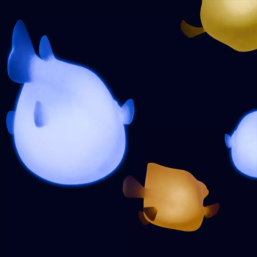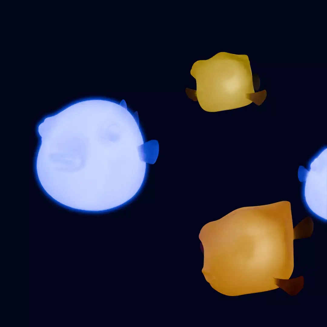 These adorable 3D works of pufferfish and boxfish were modeled using Blender.The rounded body shape and cute fin movements are designed to be soothing just to look at.The pufferfish has a plump, soft form, while the boxfish has a distinctive square silhouette, each clearly expressing its unique personality.