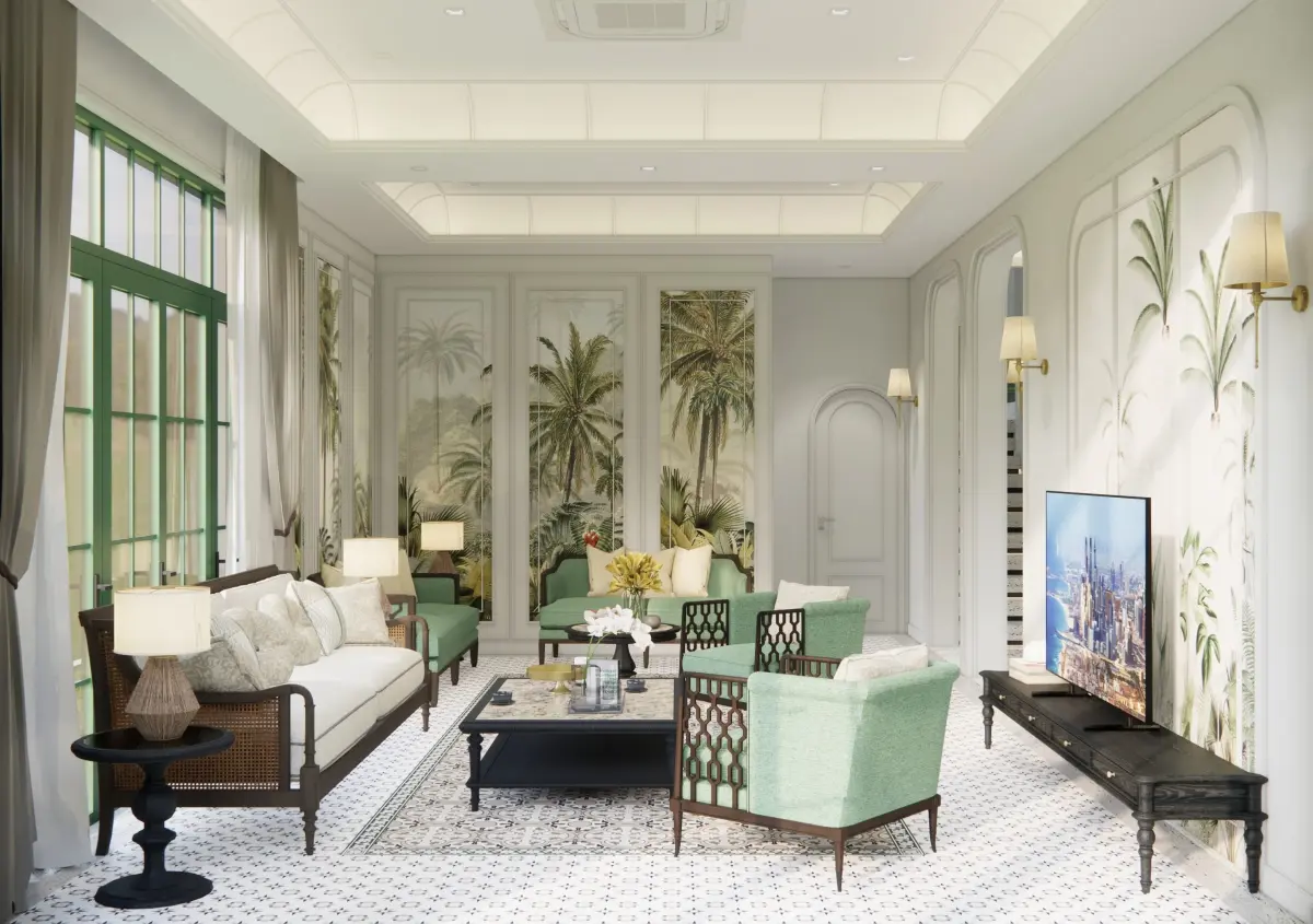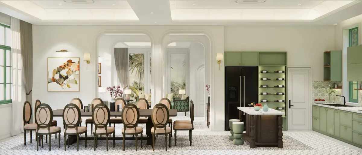 Living room & dining room & kitchen & main entrance of the tropical villaVilla in tropical Southeast AsiaIndochine styleOptimized and lightened the sketchup fileAvailable HDRIAvailable Scene, camera, sectionmanaged layersNew Enscape settingsA few small improvements to the 3d modelFaster render times