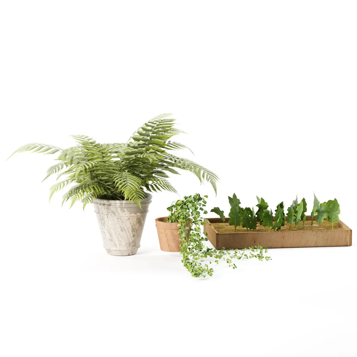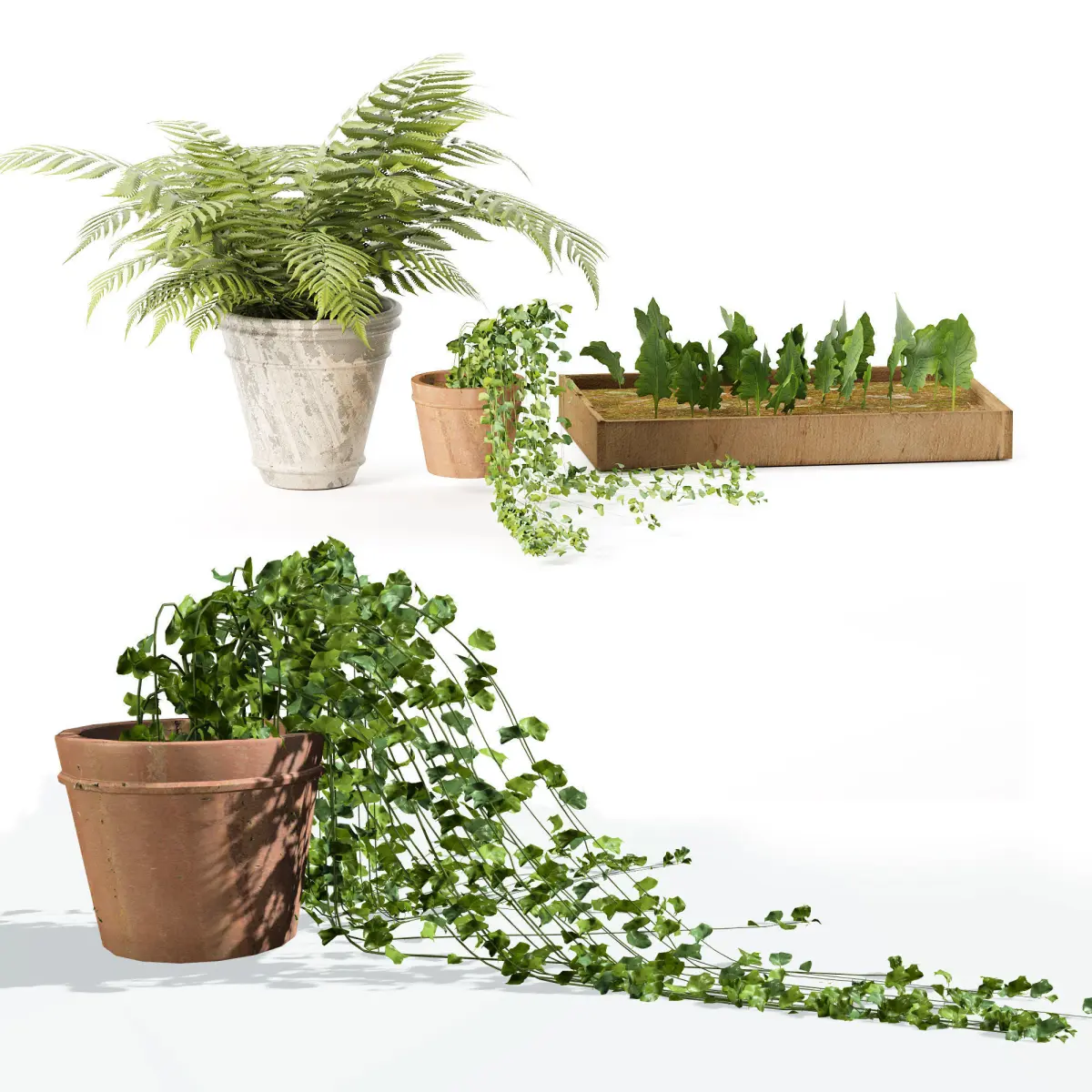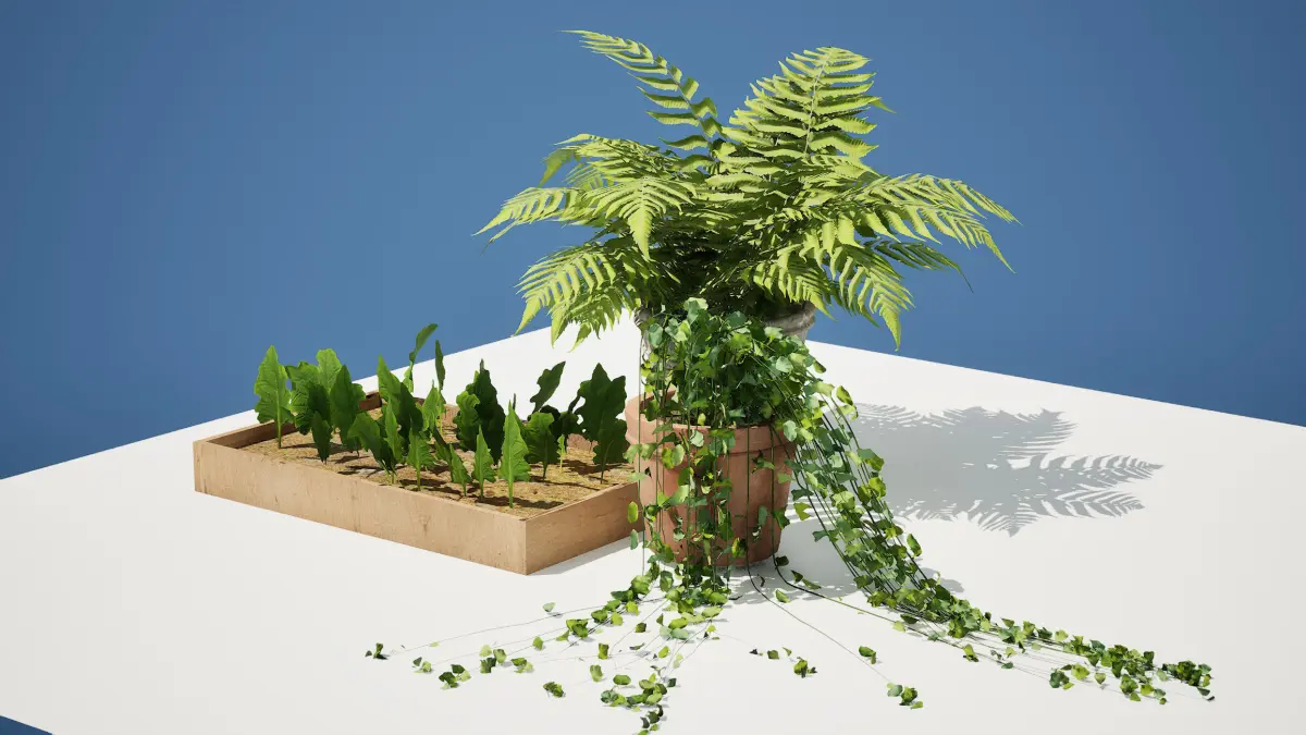 fern pot model has 6658 polygons tiny plants model has 2401 polygons tiny plants model has 155571 polygons