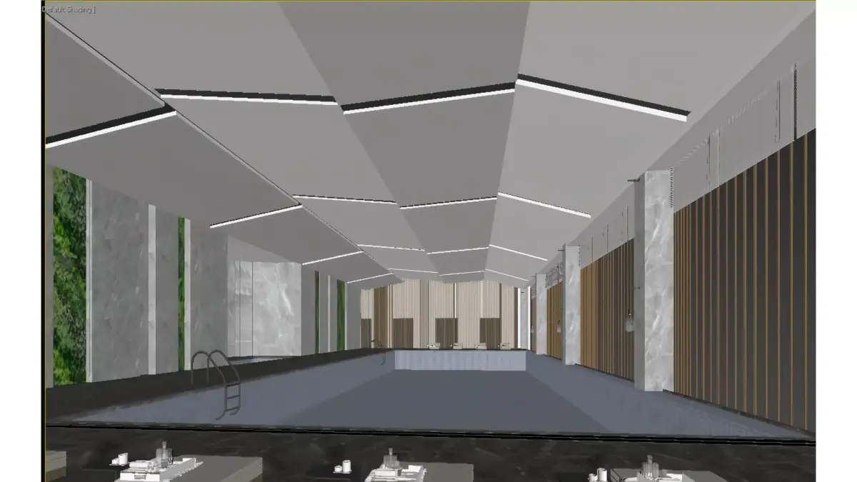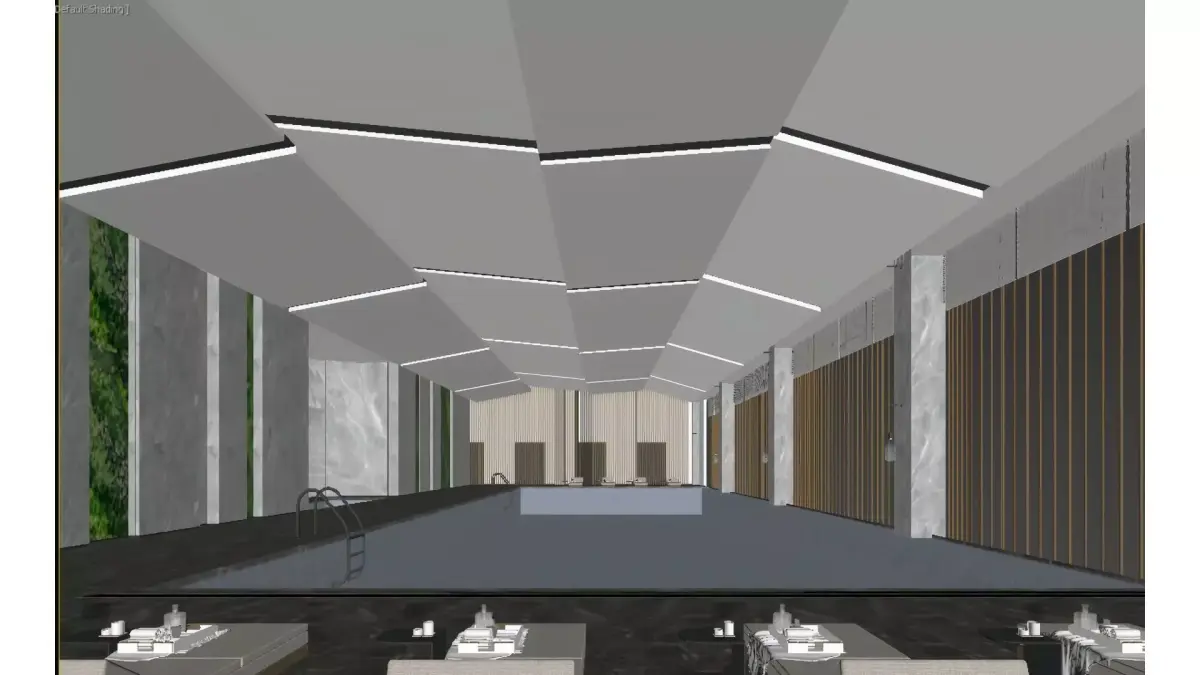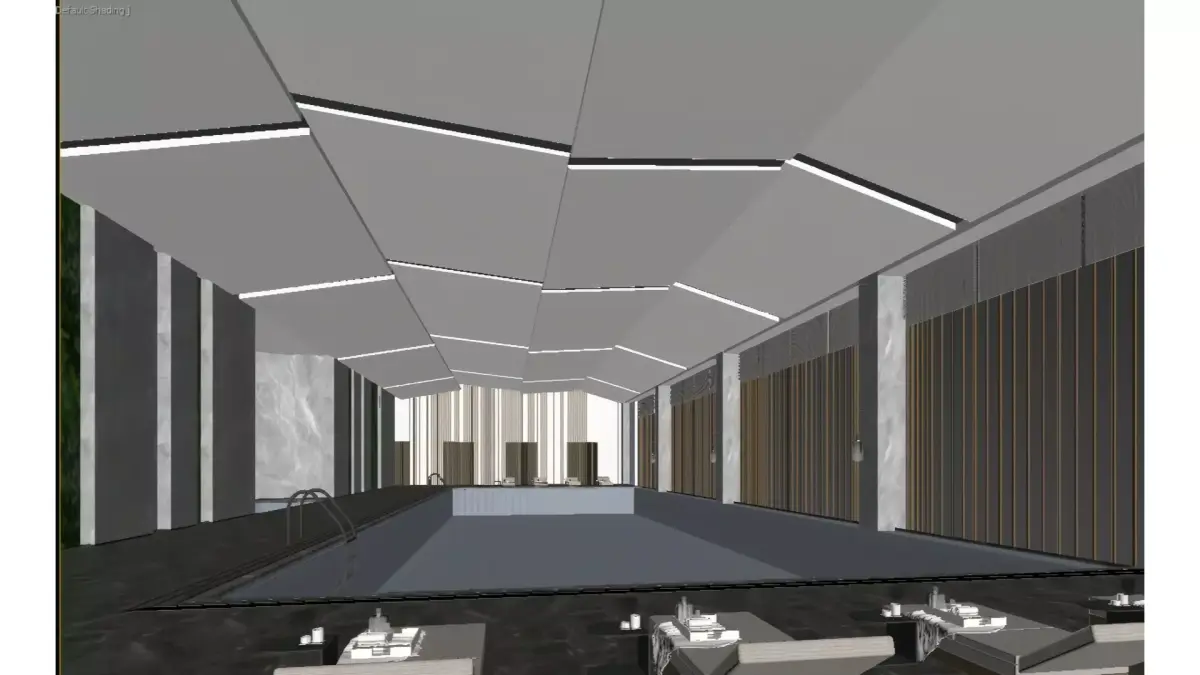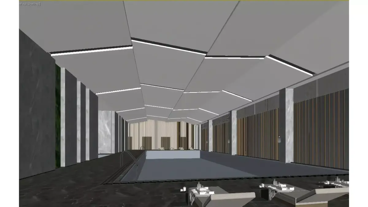 This is an indoor heated swimming pool space that blends luxury with modern aesthetics. The suspended geometric ceiling defines layers with clean lines, creating an open visual dynamism.On the left, the living green wall and natural marble columns form a material contrast, infusing the sleek space with natural vitality; on the right, the full-height floor-to-ceiling windows are paired with a grid-type sunshade system, which ensures ample daylight while filtering harsh direct sunlight, casting soft ripples on the water surface as light refracts.The dark marble flooring complements the clear pool water in perfect harmony, and the light luxury lounge area by the pool offers a comfortable setting for socializing and relaxation. The overall design integrates urban luxury with an eco-friendly experience, making it an iconic supporting space for high-end hotels or private clubs.