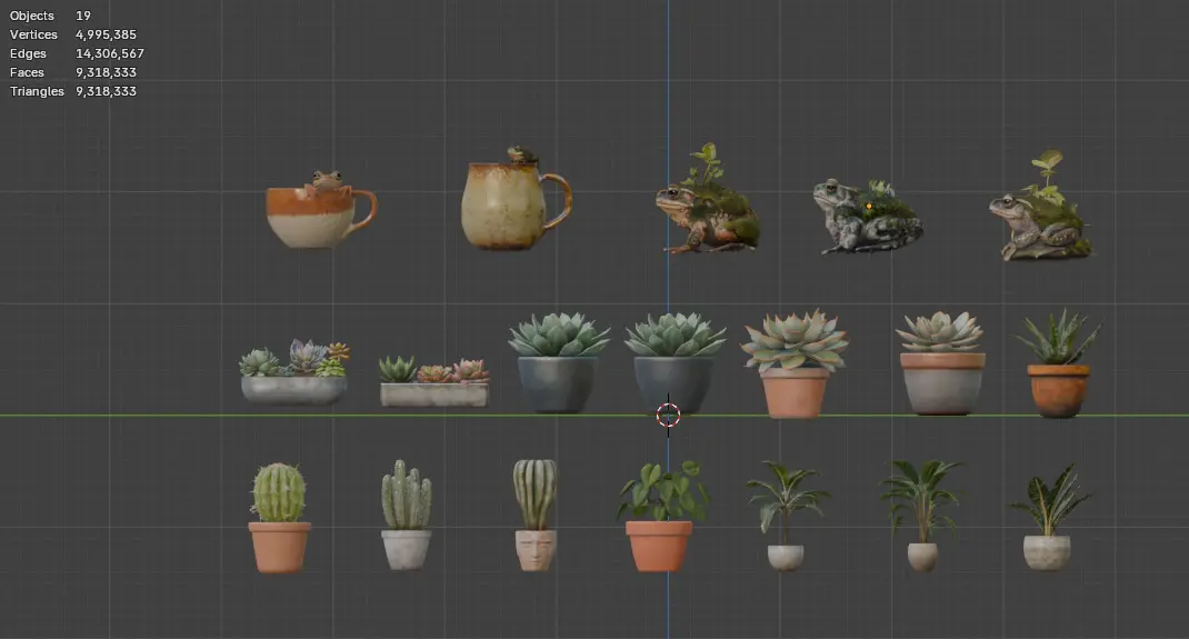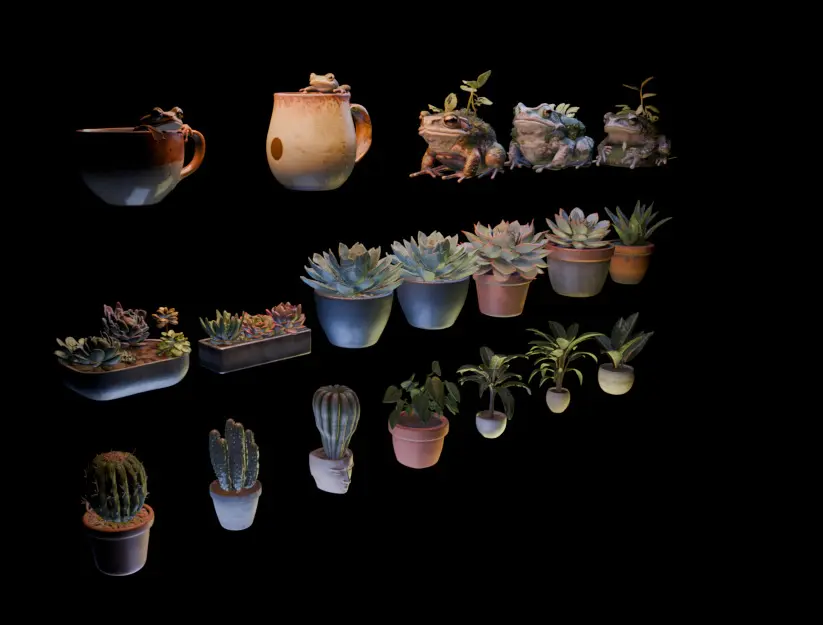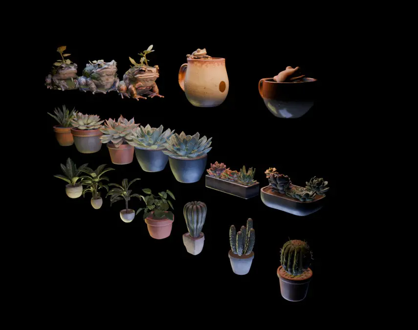 A charming and versatile collection of high-quality 3D models perfect for adding life and detail to your virtual greenhouse, garden, interior design, or similar scenes. This pack includes two realistic toads, two hand-crafted earthenware frog mugs, and eleven assorted potted plants (featuring succulents, cacti, aloe, and broadleaf indoor ornamental plants), offering a wide variety of organic and natural elements.
