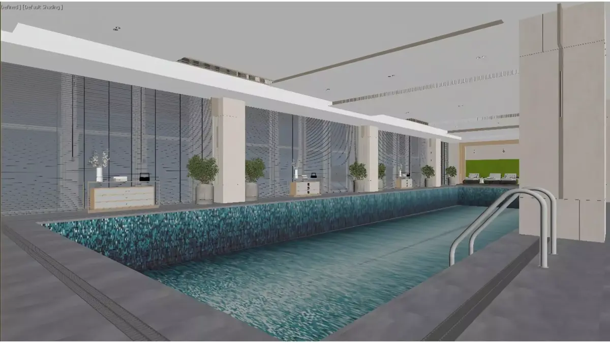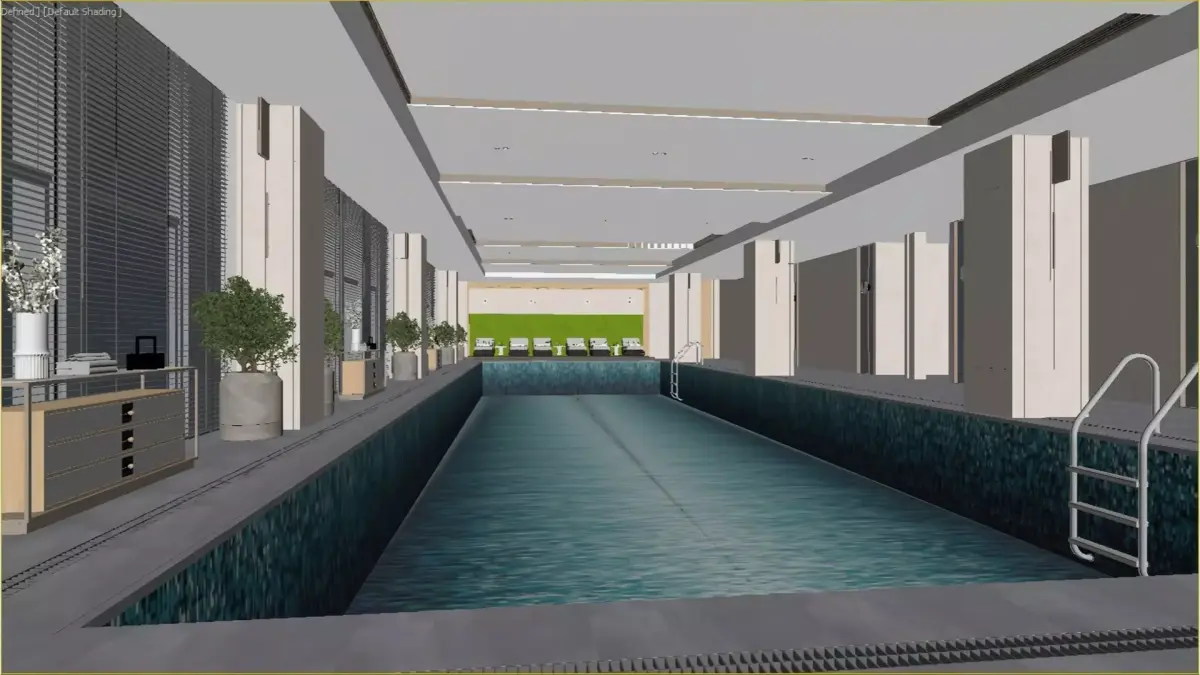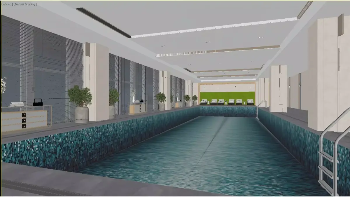 This is a high-end indoor heated swimming pool in a modern light luxury style. The overall space is open and transparent, with light-colored stone and metallic lines creating an exquisite and grand atmosphere. The pool water is crystal clear, with large floor-to-ceiling windows symmetrically distributed on both sides, offering a panoramic view of the city. The poolside is adorned with green plants and minimalist furniture, complemented by soft linear lighting, which combines functionality with aesthetic appeal. This is not only a professional fitness and swimming space but also an ideal place for business people and high-end guests to relax and enjoy a quality lifestyle, perfectly suited for high-end hotels, private clubs, and other similar settings.
