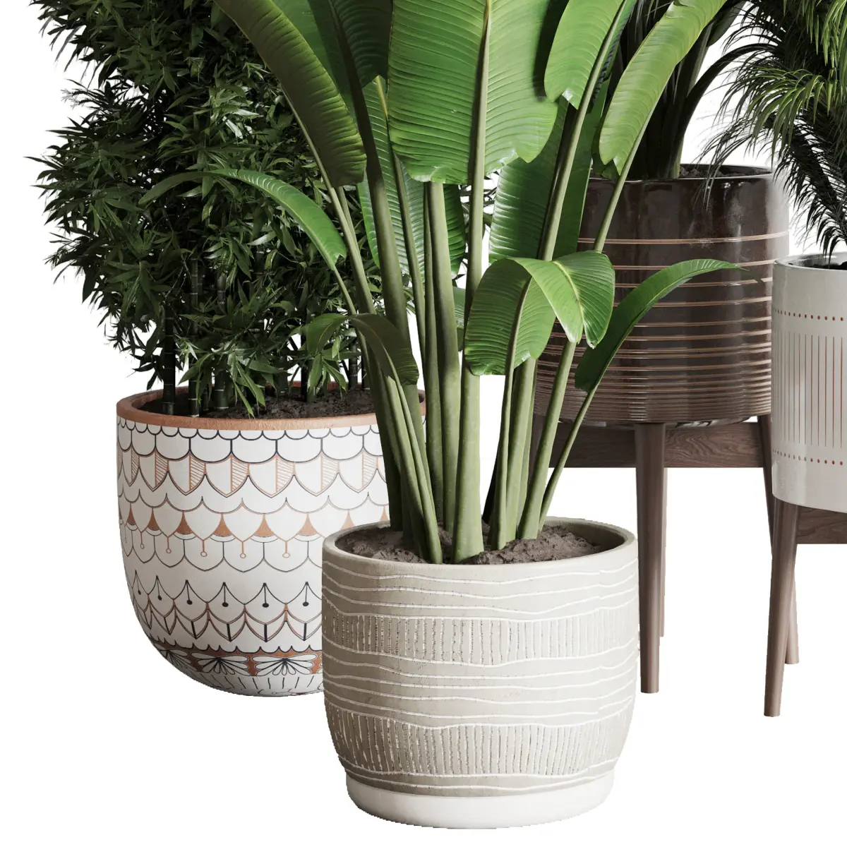 collection indoor plant ficus palm ravenala bamboo of earthenware and patternd concrete vases