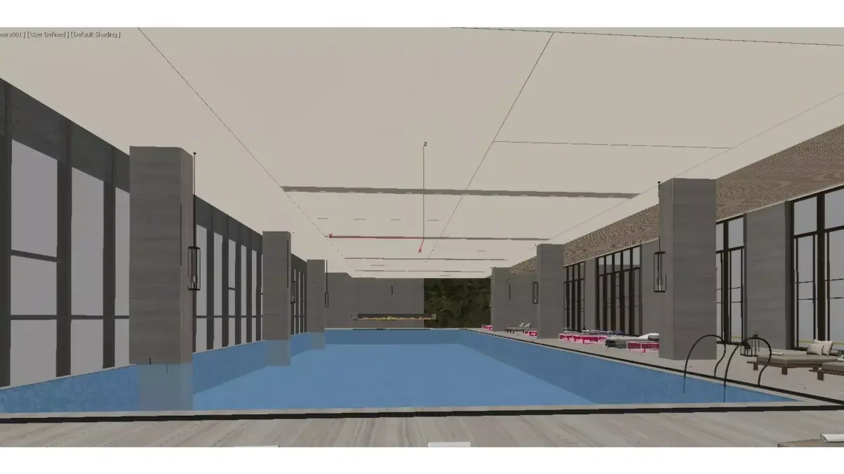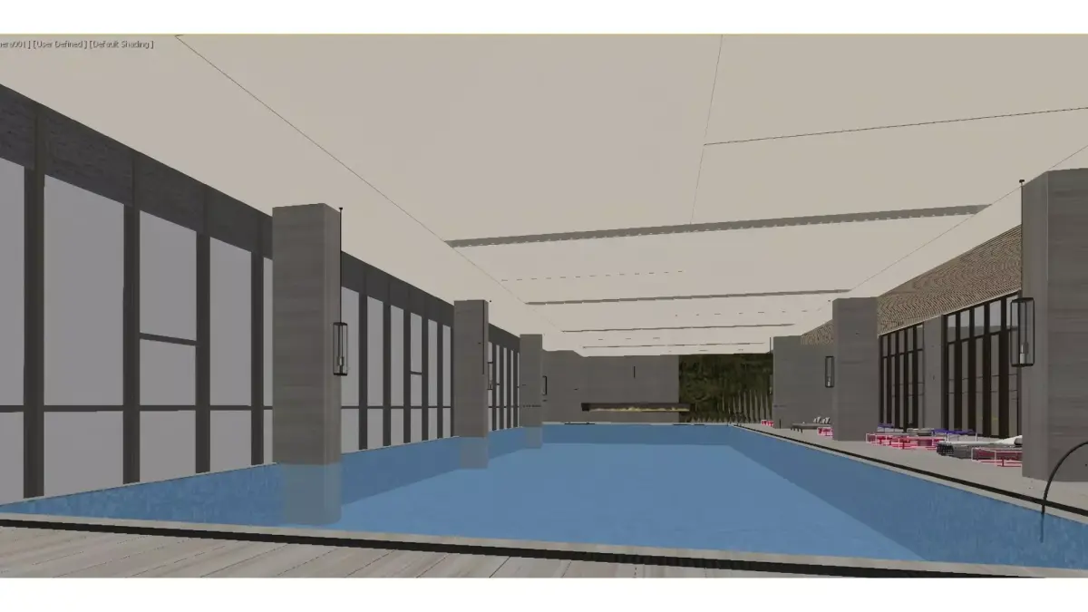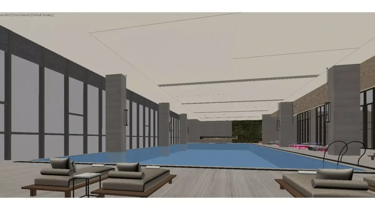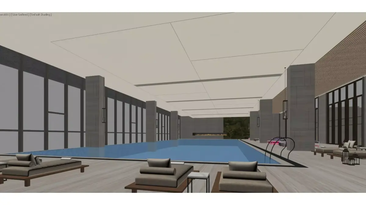 This is a modern and light-luxury high-rise indoor swimming pool area. Large floor-to-ceiling windows bring in the urban and natural landscapes, paired with light-toned stone materials, wooden elements and minimalist casual furniture, creating a high-end and comfortable atmosphere. The crystal-clear swimming pool, combined with soft lighting and exquisite soft furnishings, boasts both visual aesthetics and leisure functions. It is a supporting facility of a high-end club that exudes both luxury and relaxation.
