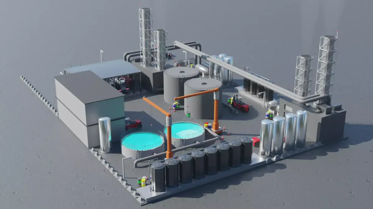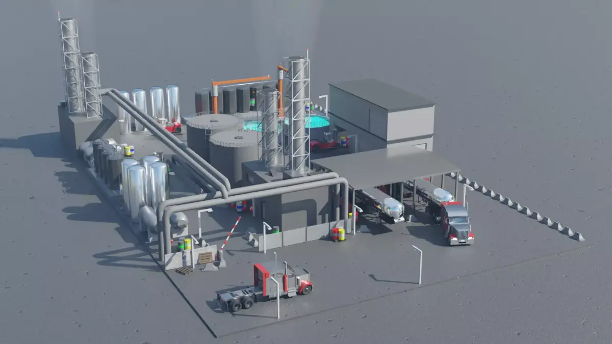 This is a highly detailed 3D model of an industial plant featuring multiple tanks, pipes, chimneys, and vehicles such as trucks and tankers. The model is designed for realistic visualization, architectural projects, and industial simulations. It includes detailed geometry and realistic materials, optimized for rendering in various 3D software.