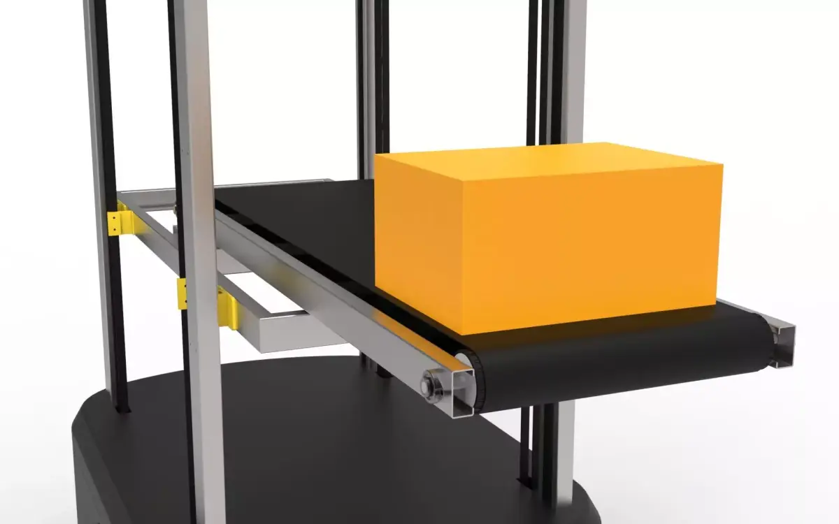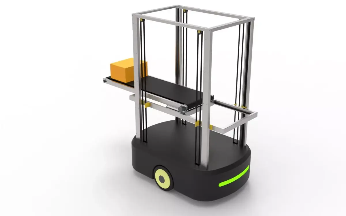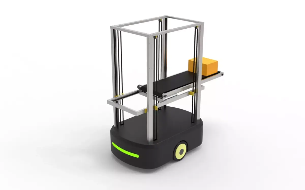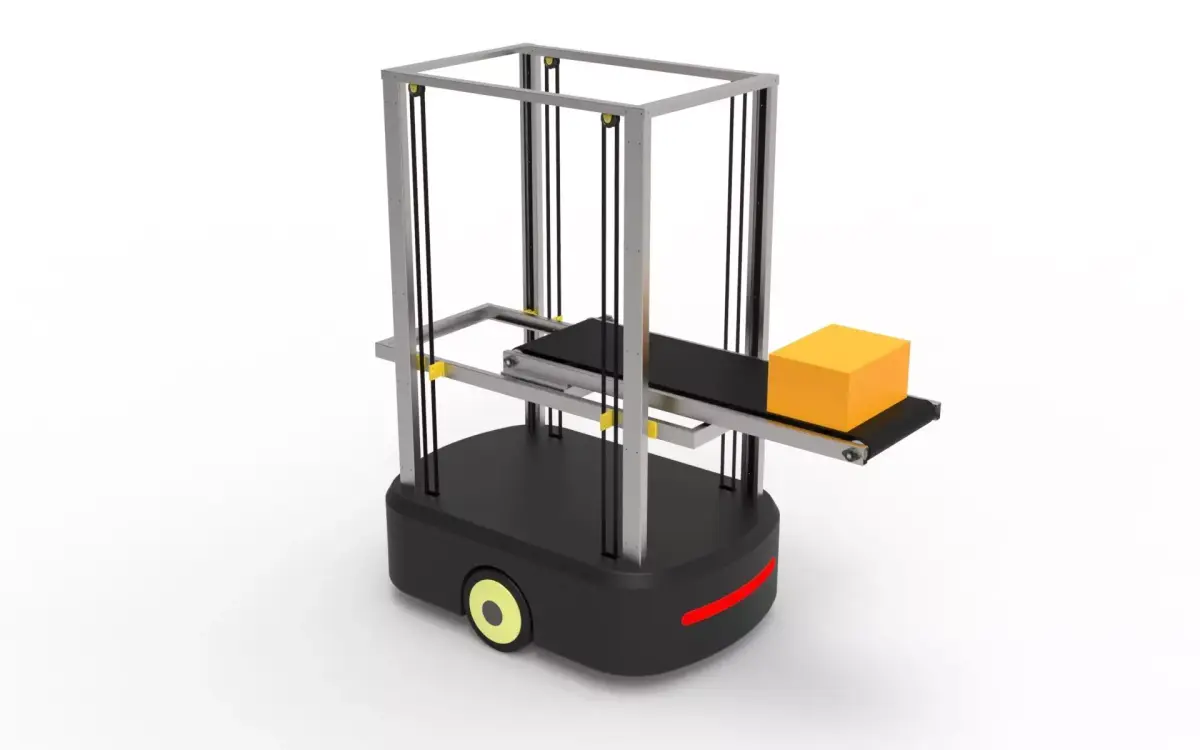 A high-precision, industrial-grade 3D model of an Automated Guided Vehicle (AGV) featuring an integrated vertical lift and conveyor belt system.