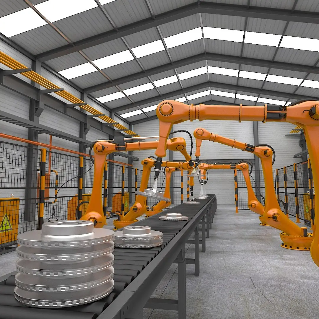This is a high quality polygonal photo-real scene of an industrial assembly line with robotic arms that is suitable for any of your projects.