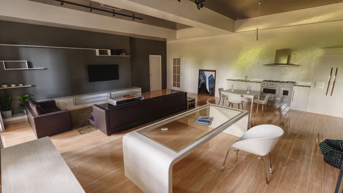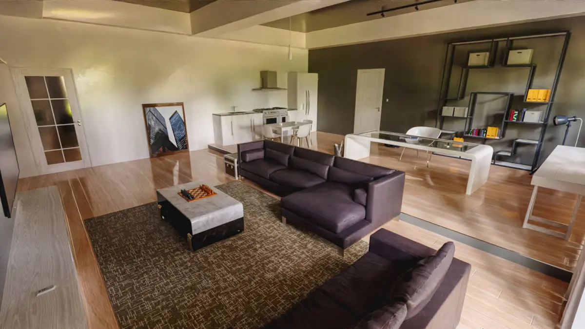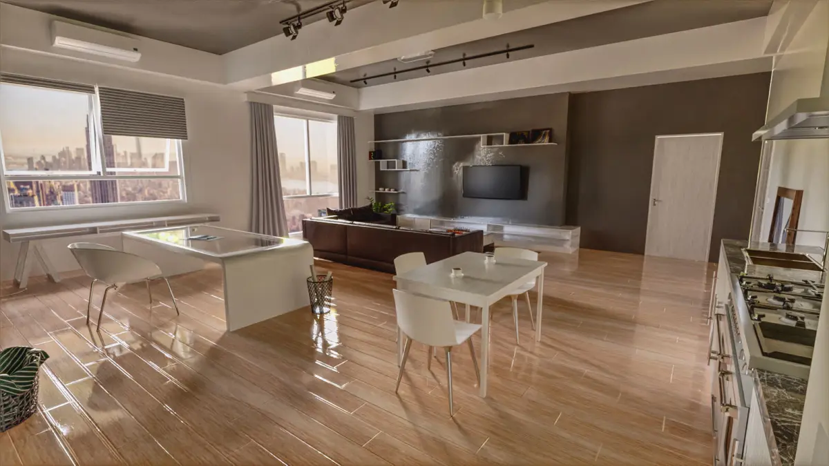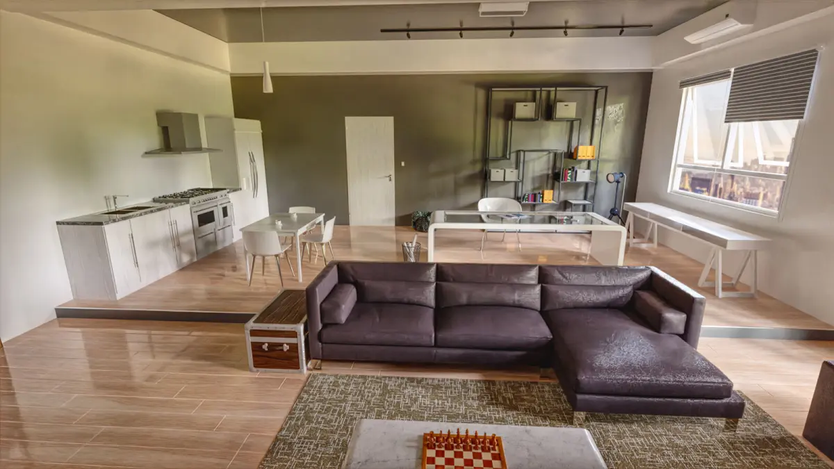 The Industrial Bachelor Apartment is a studio in an industrial complex.It is clean, with modern furniture and appliances, and has a kitchen with stainless steel appliances. The living room has a sofa, a large flat-screen TV, and wooden flooring. There is also a dining room with a table and chairs.