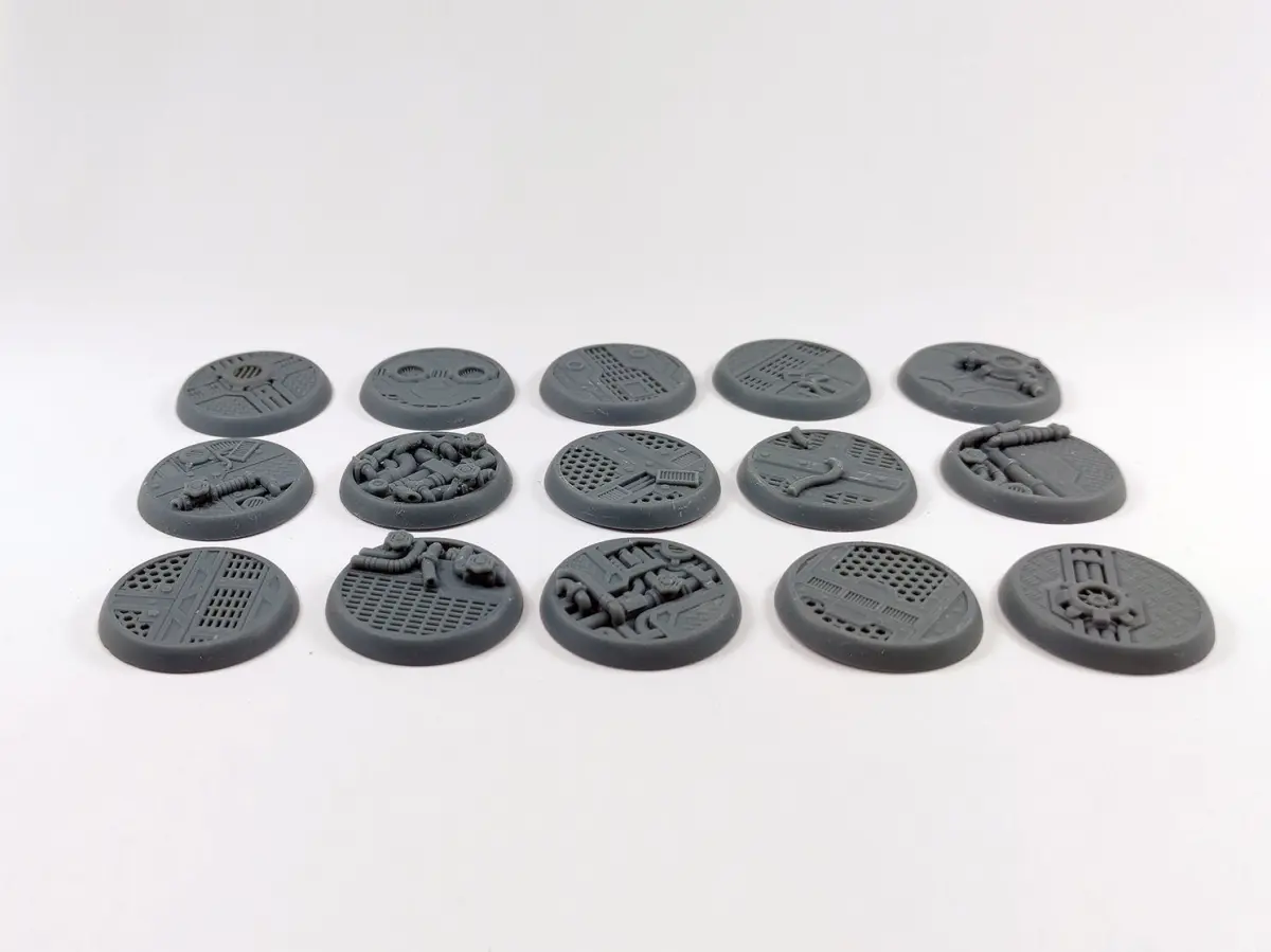 Set of 15 bases with an industrial theme, perfect for setting the tone for your post-apocalyptic/futuristic miniatures.The bases are available in pre-supported and unsupported versions.These bases are slightly larger than the traditional 25mm bases, measuring 28mm in diameter.