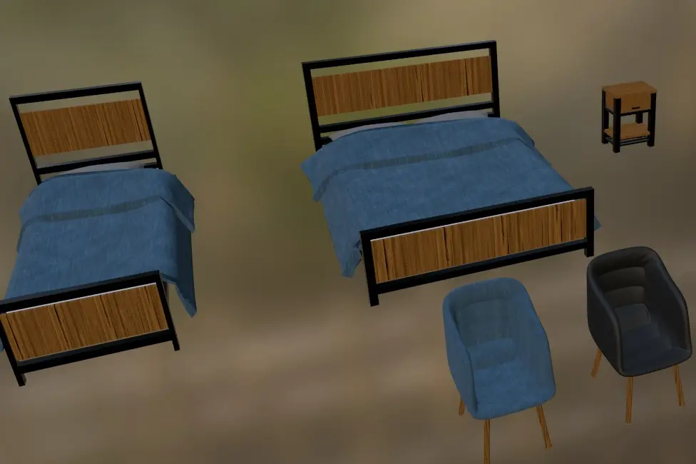 This pack has the following items:1 Single bed1 Double bed1 Bunkbed2 Wardrobe1 Simple desk1 L-shaped desk1 Bed table (wtih a simple open & close animation)1 Chair (with 2 variations of color)