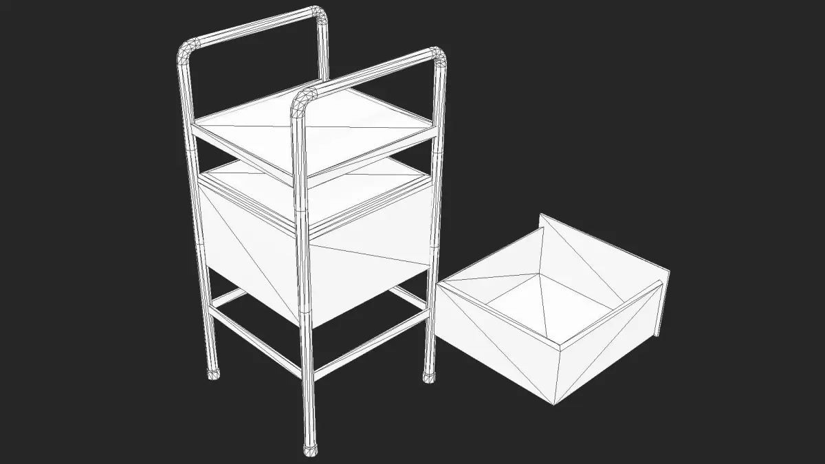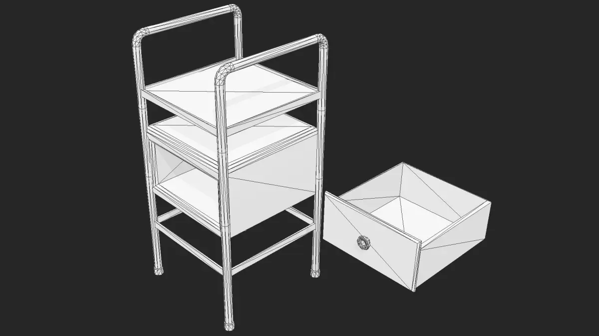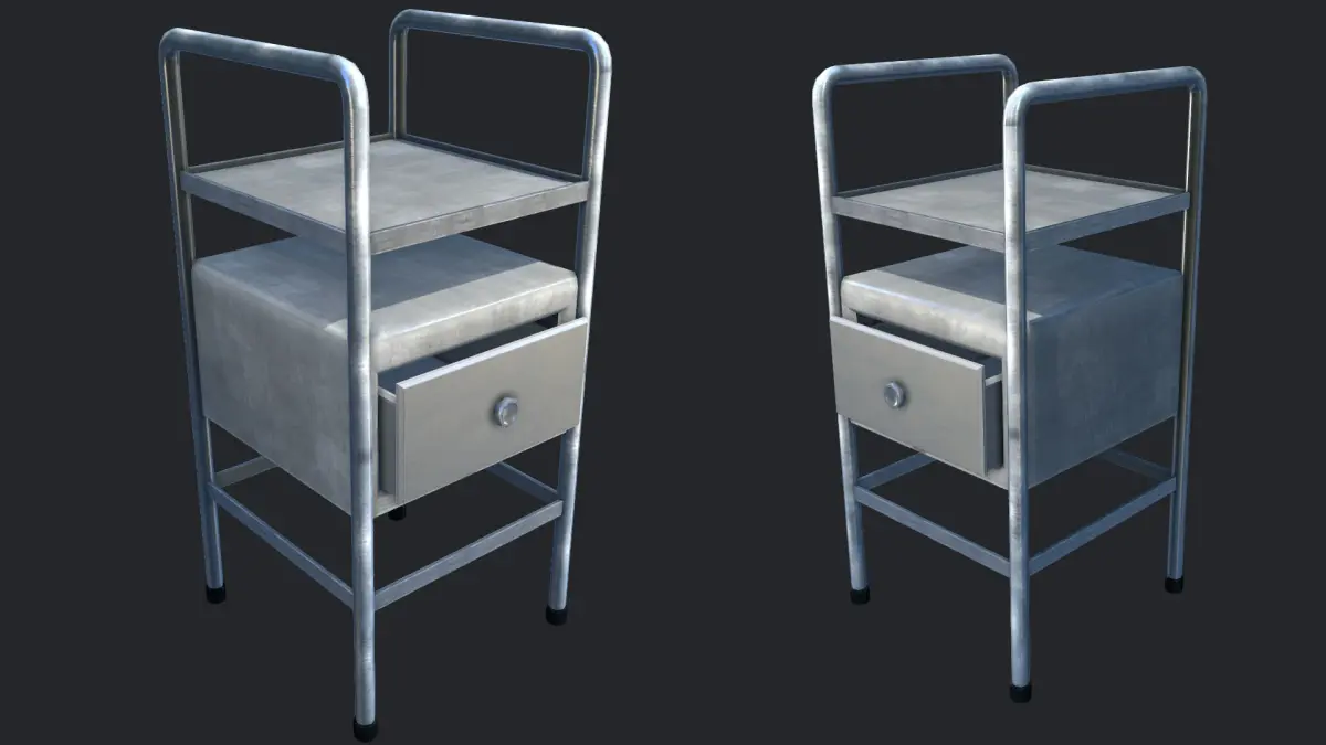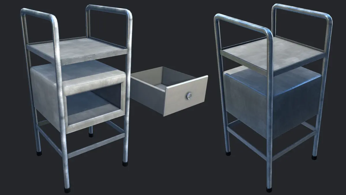 Very Detailed Industrial Steel Bedside Table, with a Scratched Steel Legs and a White / Cream Base color. The Model is Low Poly, and perfect for any game environments, such as fps horror, MMO, Survival, etc.