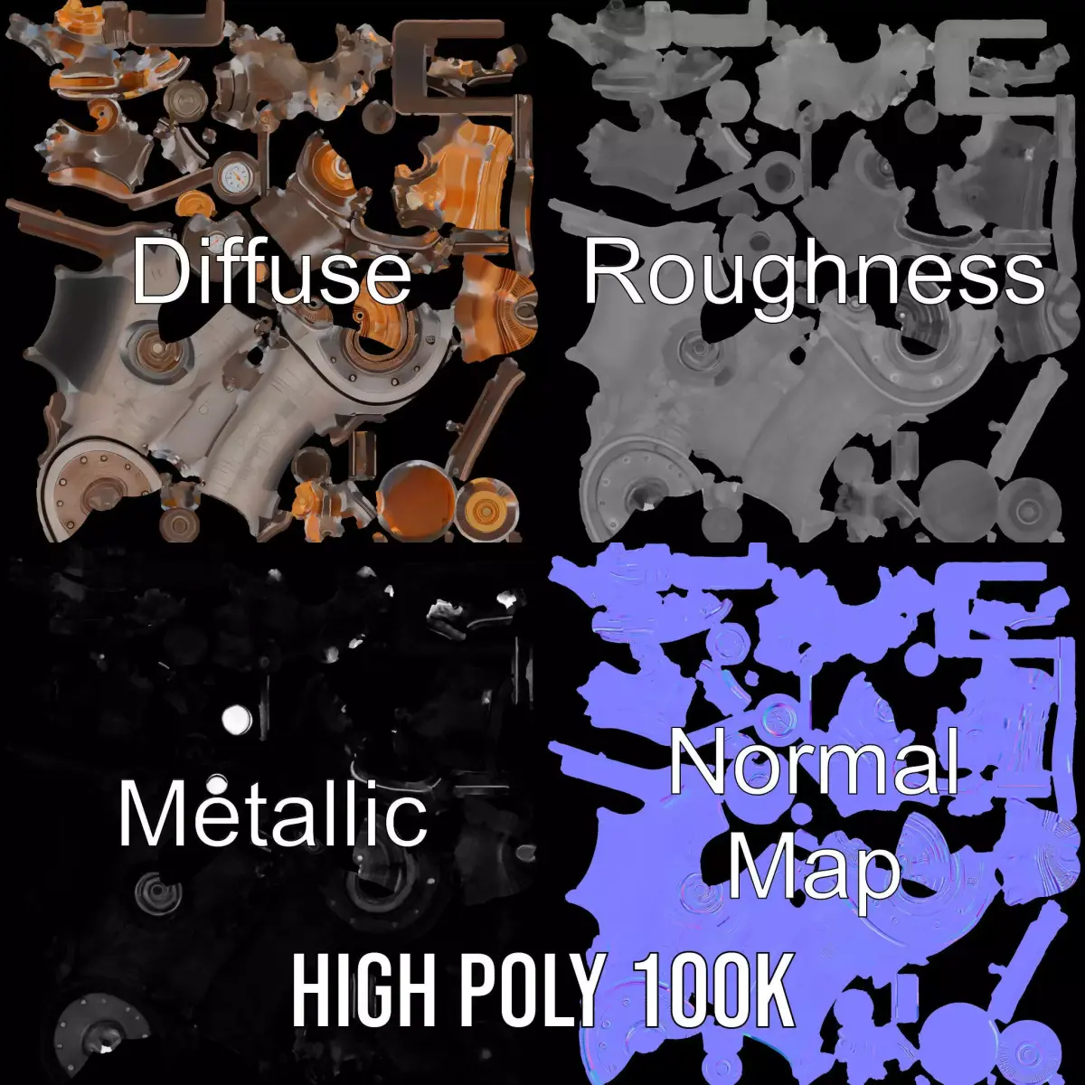 This 3D model captures the intricate details of an industrial brass gauge system, perfect for adding authenticity to steampunk designs or factory settings. Each model has 3 levels of detail: low-poly (1000 triangles for mobile), middle-poly (10,000 triangles for environment), and high-poly (100,000 triangles), which allows for the use of this model in production rendering (such as 3ds Max, Maya, Cinema4D, Blender, Vray/Corona/Cycles, and all others), game engines (Unity and Unreal compatible), and interactive presentations, providing a choice of detail based on the LOD System principle. The model is ideal for use in technical simulations, visual effects production, or historical themed projects. The model's textures are PBR, Diffuse, NormalMap, and reflection/roughness/metallic, suitable for any modern rendering engine. All models accurately unwrapped and have no overlapping UV. All textures are 4096x4096 in size. Please like and leave a comment if you enjoyed this model.