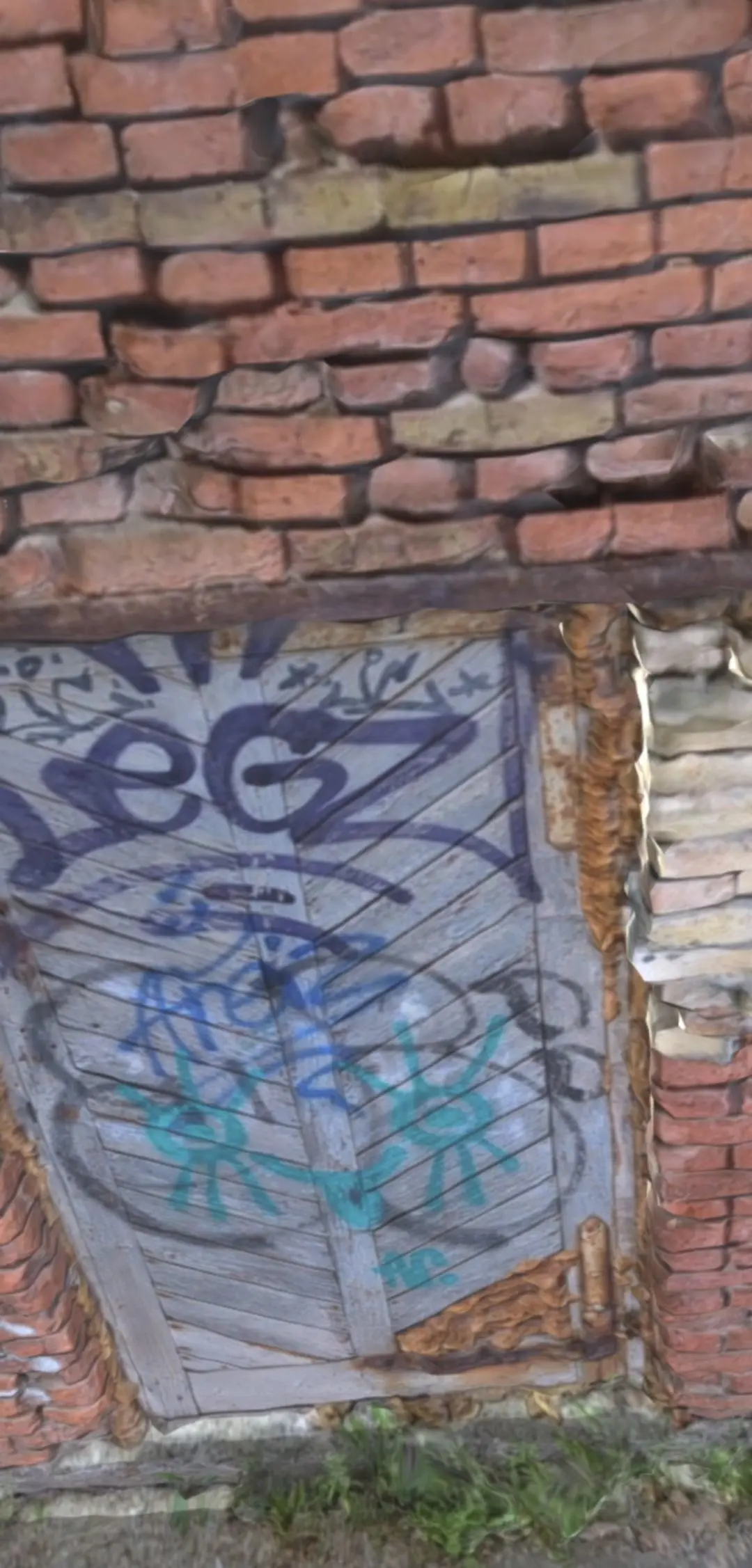 This is a brick wall of old abandoned factory with door in the center covered by graffiti.