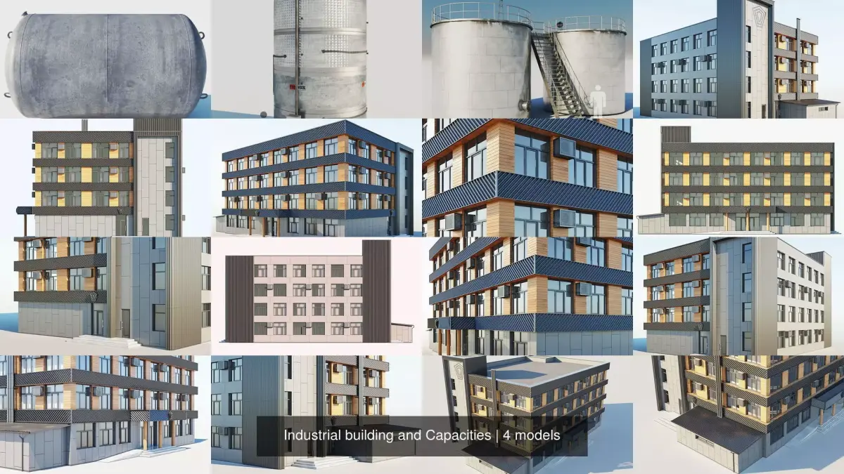 Industrial capasity model ready for rendering textures included The third capacity in my collection for industrial models Includes nice material of painted metal W: 16200 mm H: 8000 mm D: 7050 mm