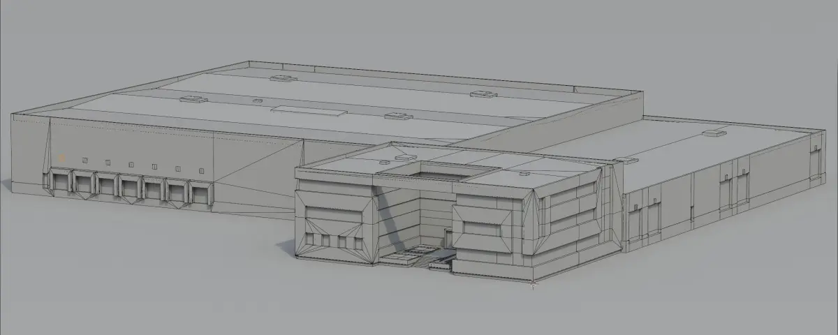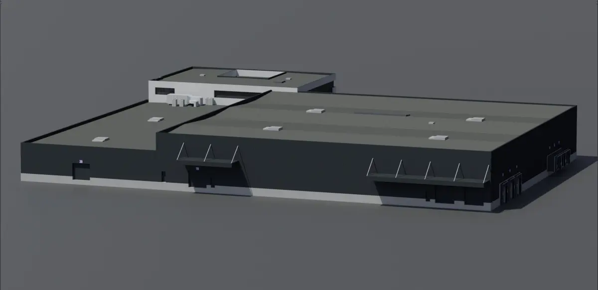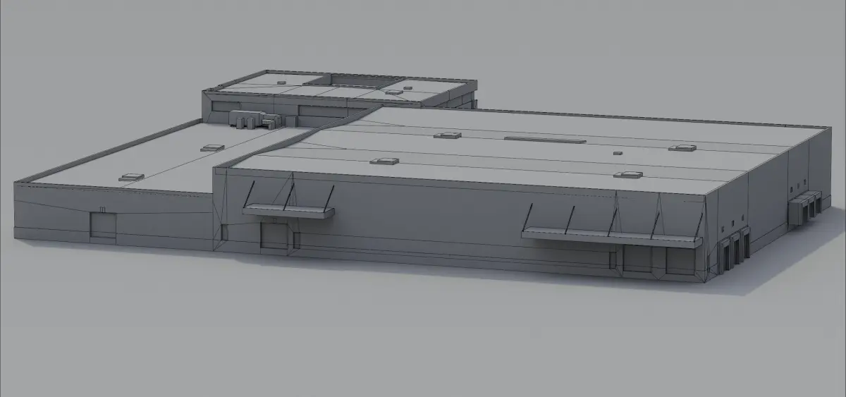 The building is modeled from an actual building situated at the Copenhagen Airport in Denmark. The model is 103 m long, 95,8 m wide and 12,4 m tall.