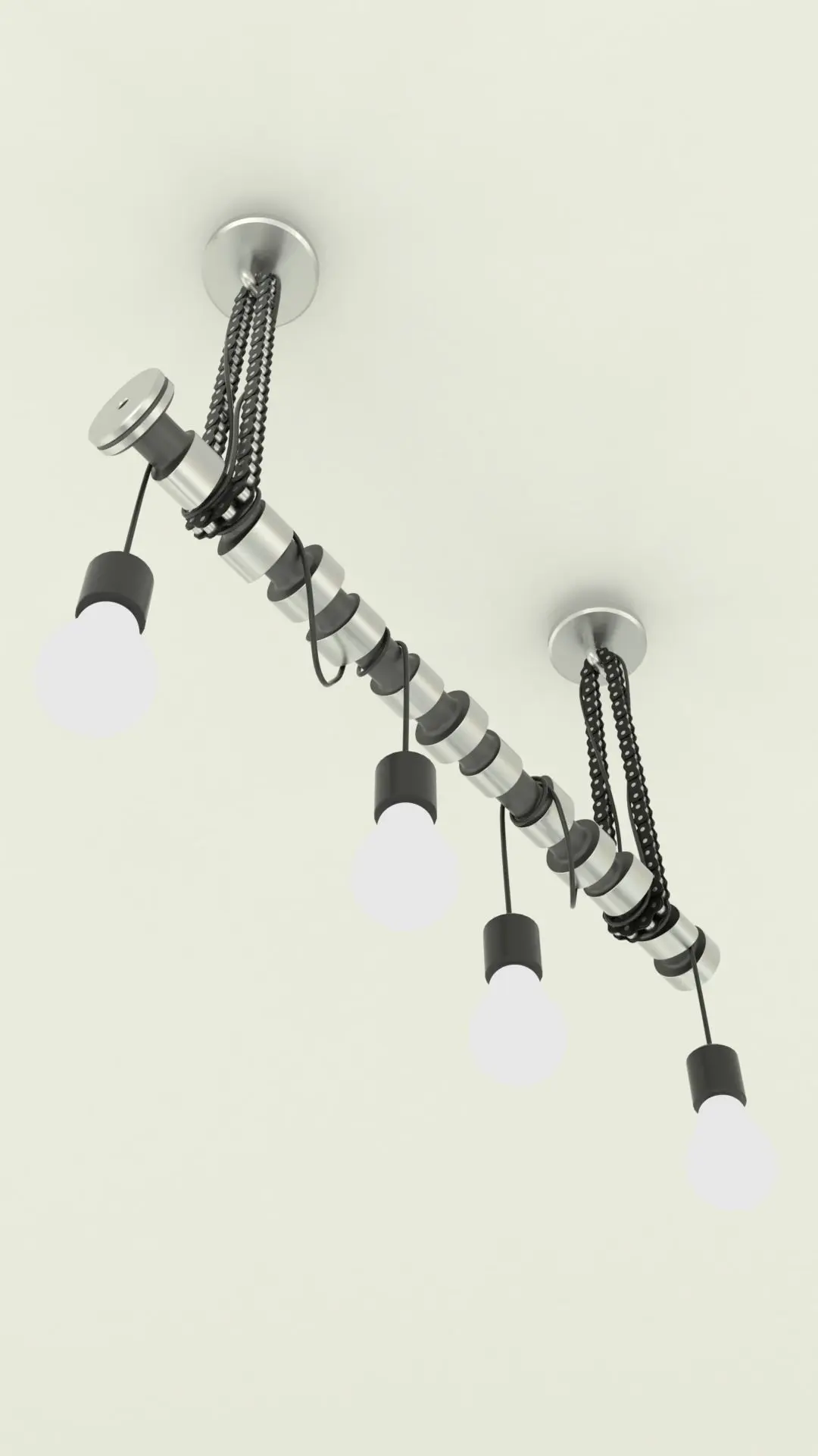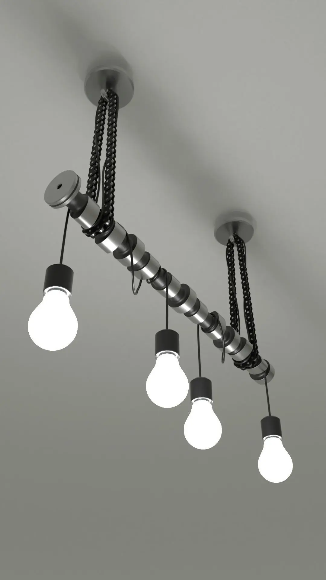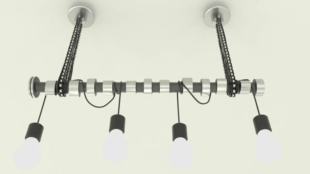 Industrial ceiling lamp.Blender 2.91PBR materials.Subdivision surface modifier,split edge, mean crease.Basic mechanical elements chain and camshaft used to build the lamp. light bulb emission node.