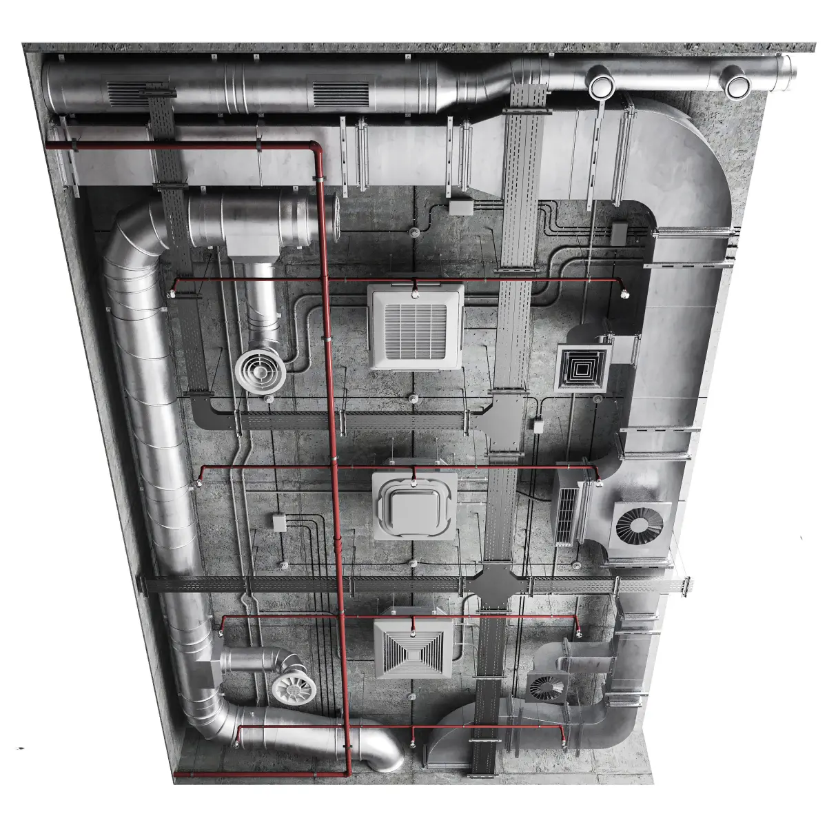 Three models of air conditioners.15 types of diffusers.Corrugated PVC pipes for cables.Smoke detectors with fire protection system.Distribution boxes for electrical males.Cables in different directions.
